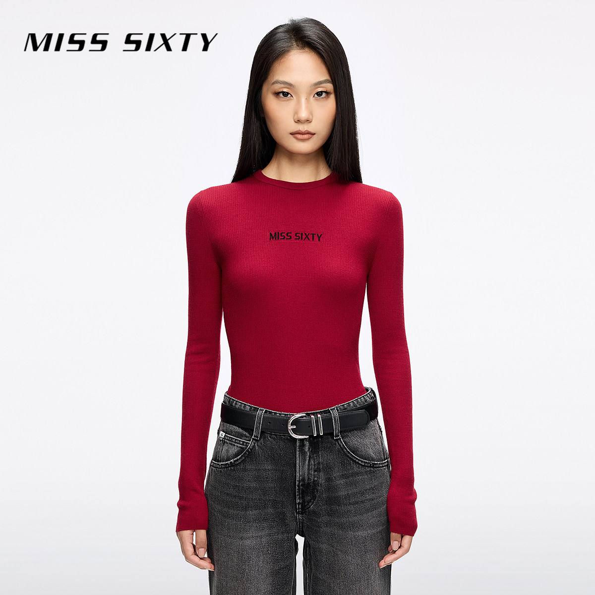 【新年穿搭】Miss Sixty25秋新款针织衫女羊毛桑蚕丝混纺红色毛衣