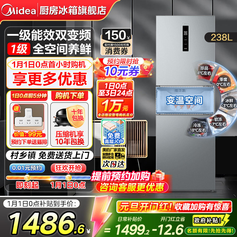 【政府换新补贴】美的249三门冰箱一级能效风冷无霜家用租房宿舍
