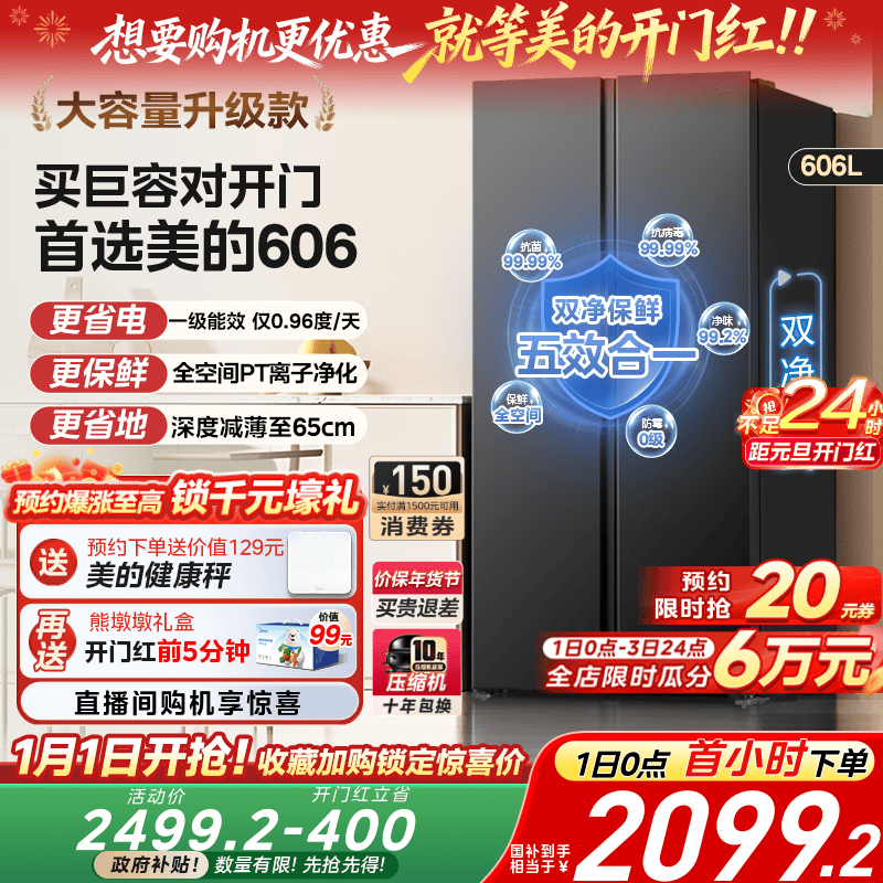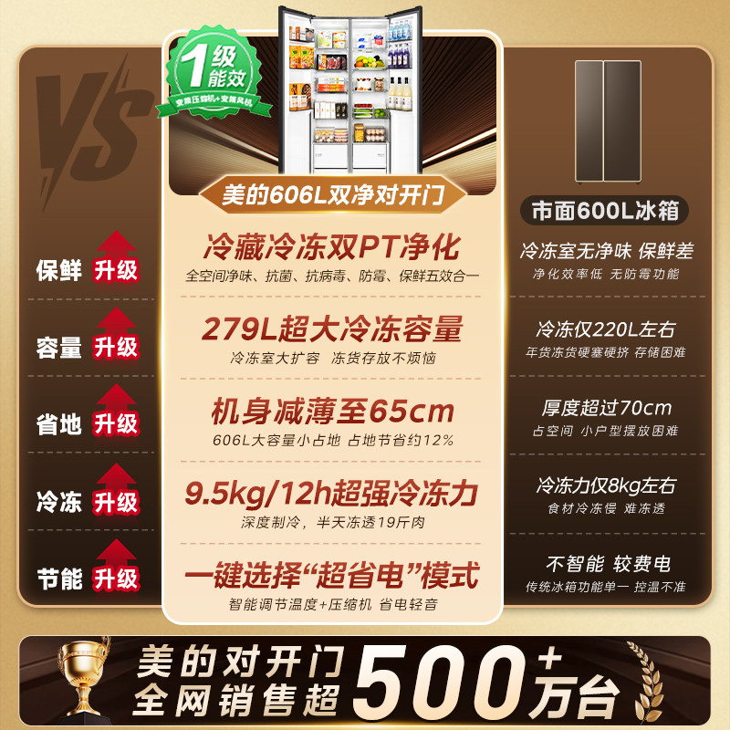 美的606对开双开门大容量超薄风冷无霜一级能效节能家用冰箱