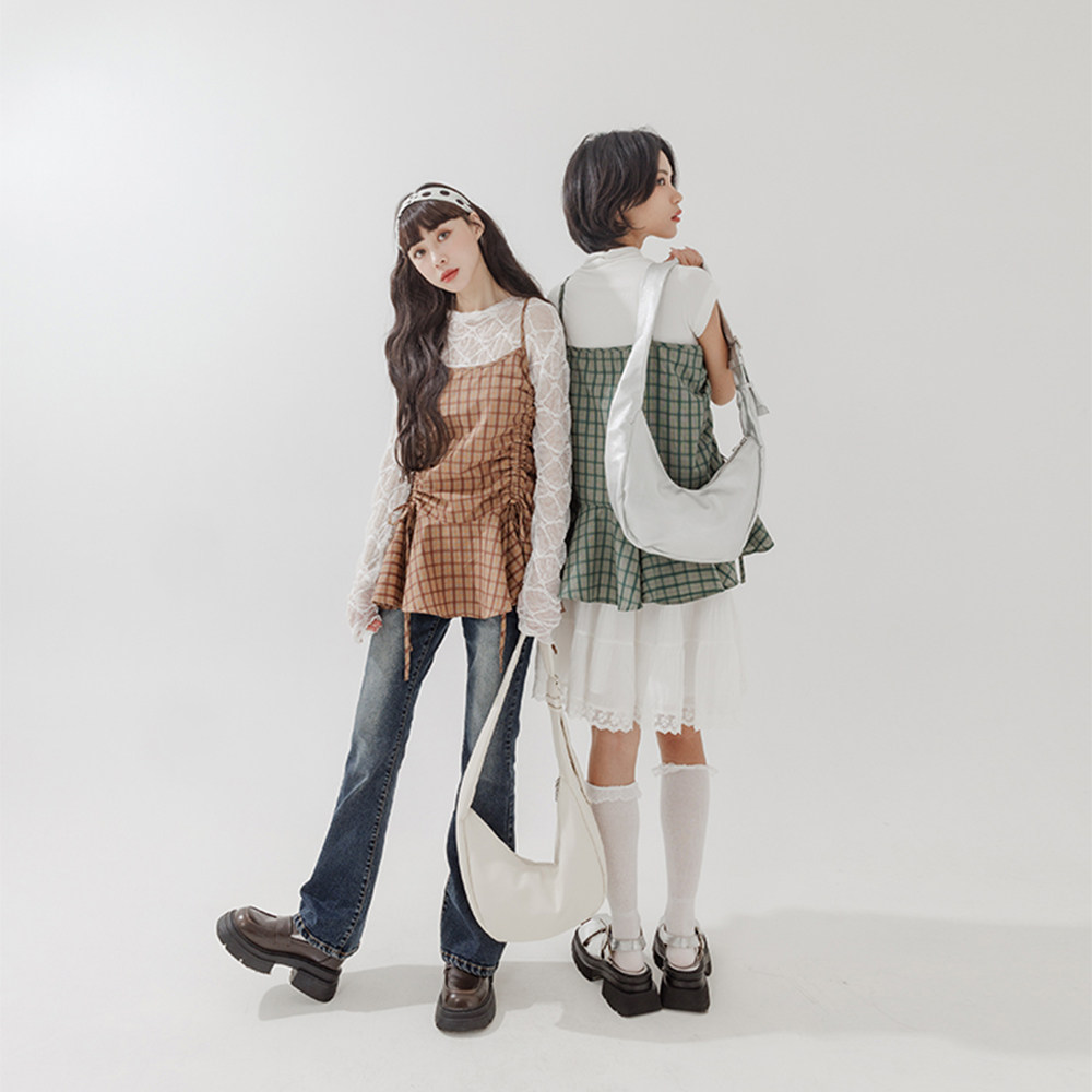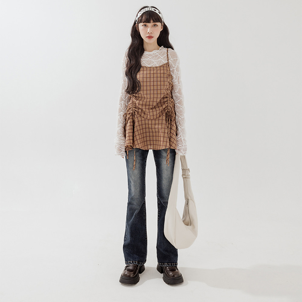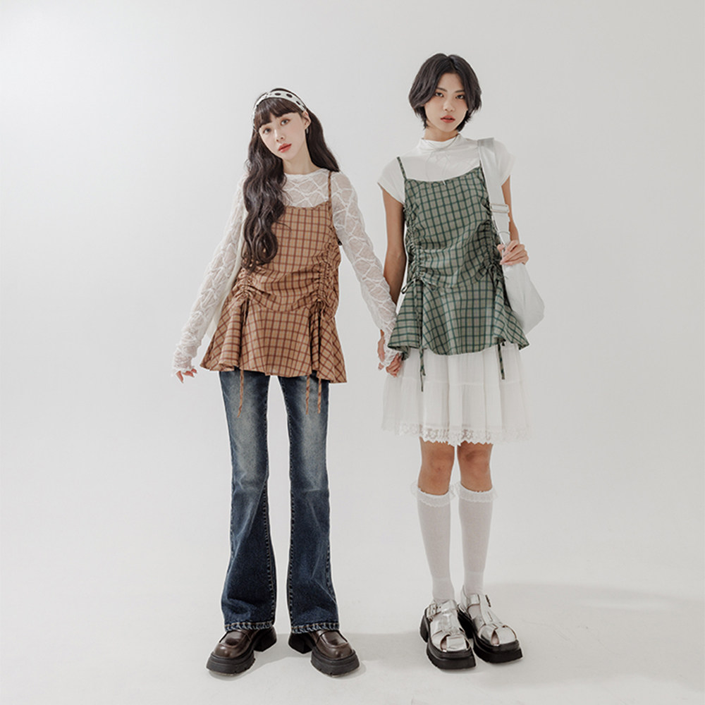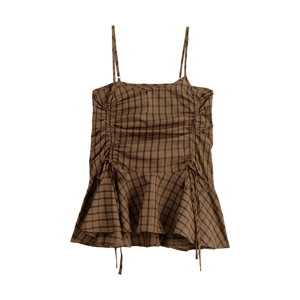 QUEENSHOP 2025秋冬新品女装抽皱设计格纹细肩带上衣01099249