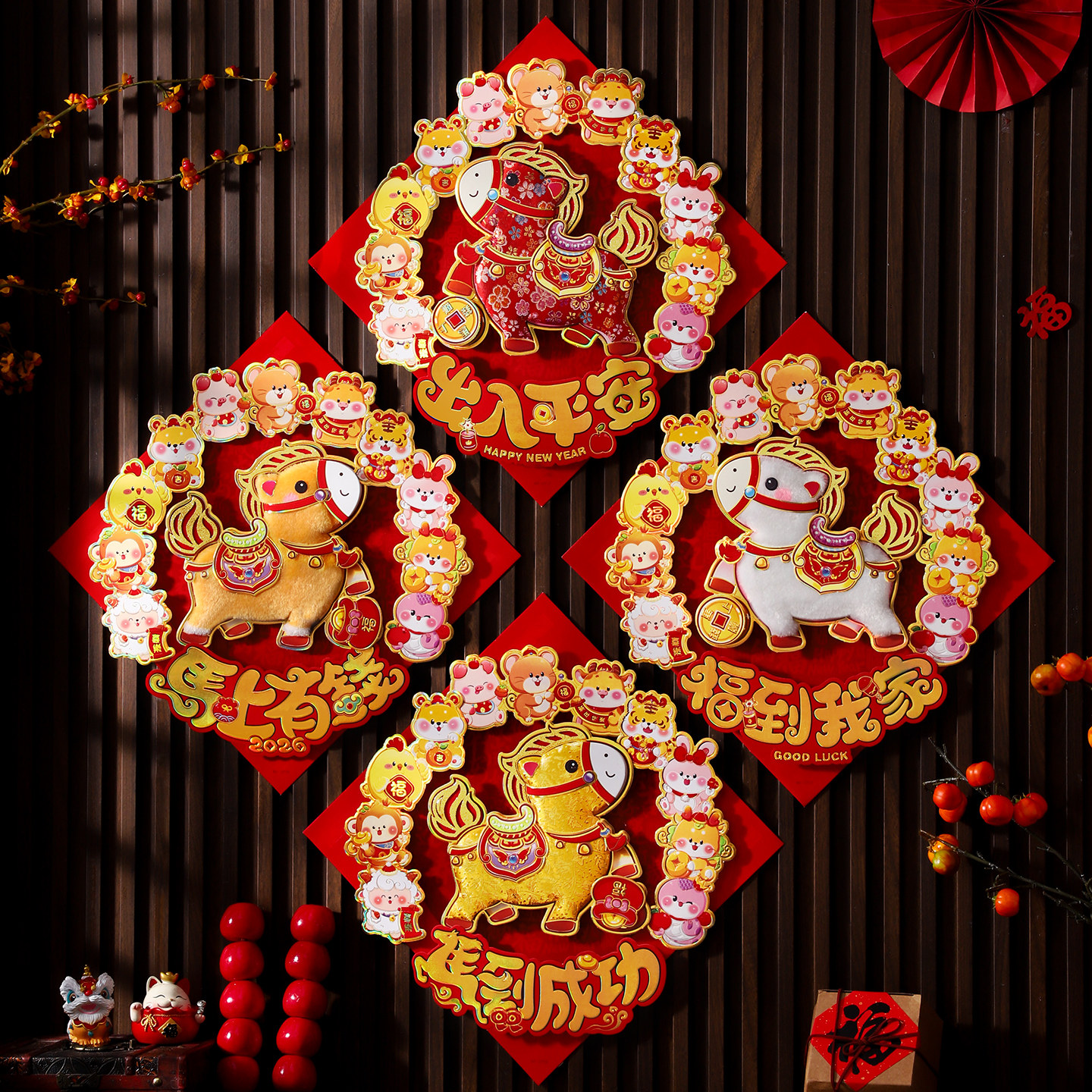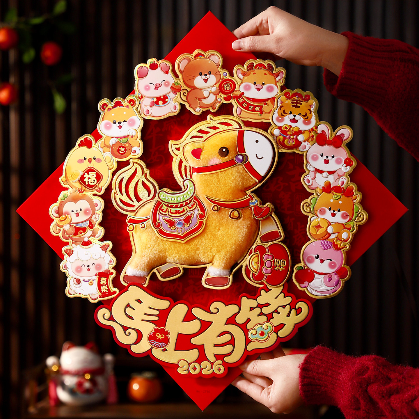 2026新年装饰立体福字门贴马年卡通生肖贴纸过年春节大门毛绒墙贴