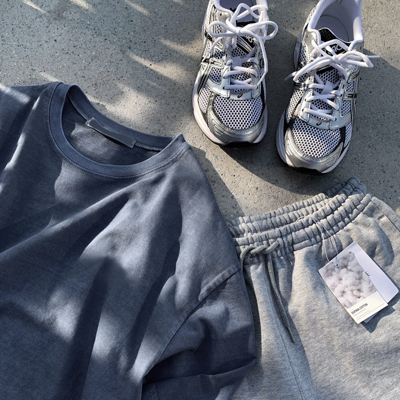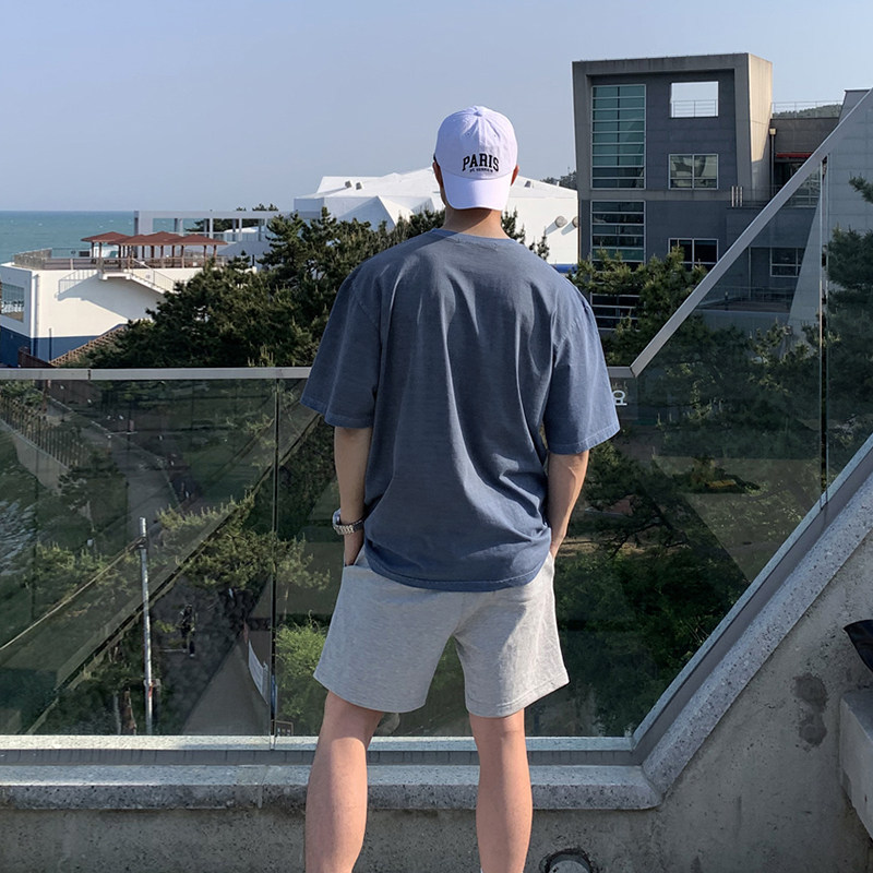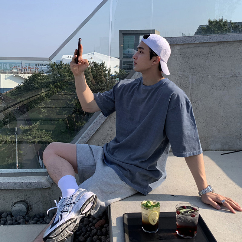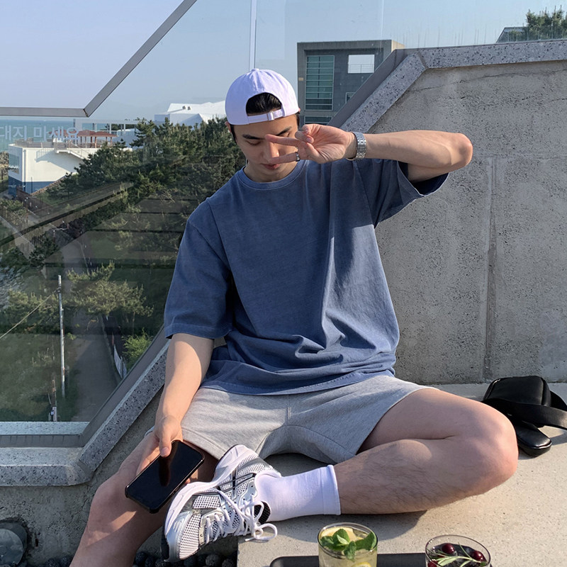 碧舍韩版潮t重工做旧水洗牛仔蓝轻熟简约阔版落肩五分短袖T恤青年