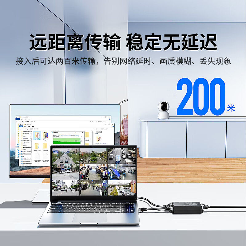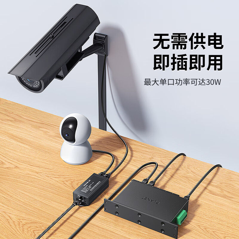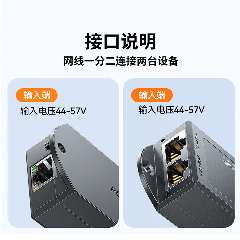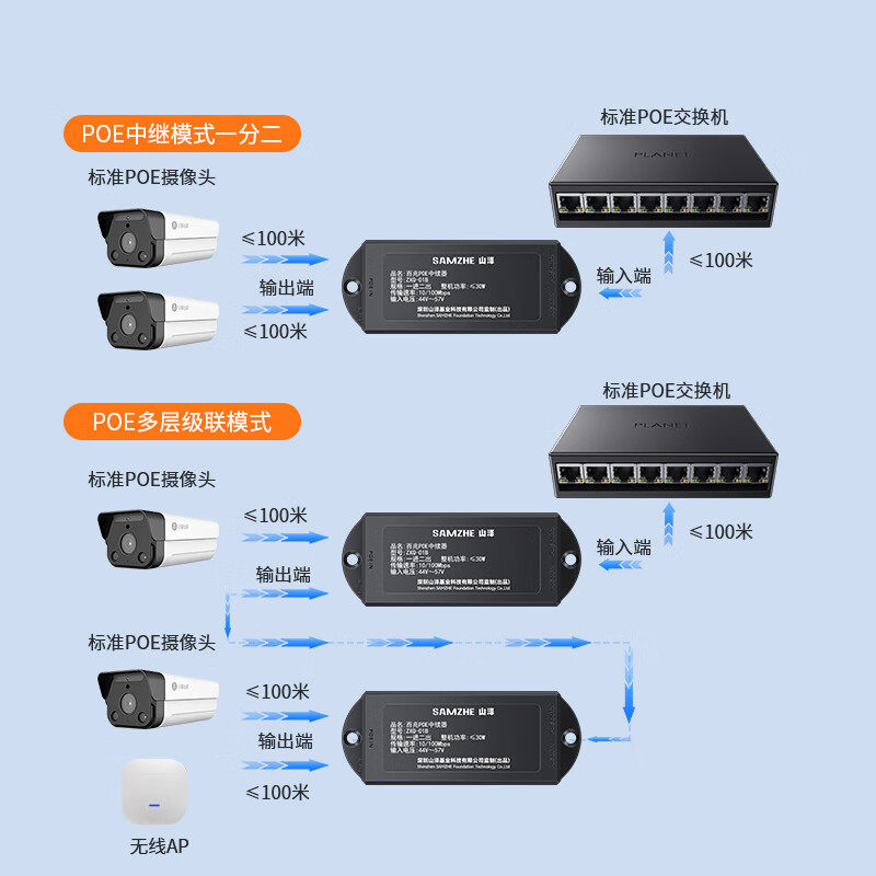 山泽百兆千兆PoE中继器一拖二 交换机摄像机网络中继延长器 一进二出家用监控网络供电分线器