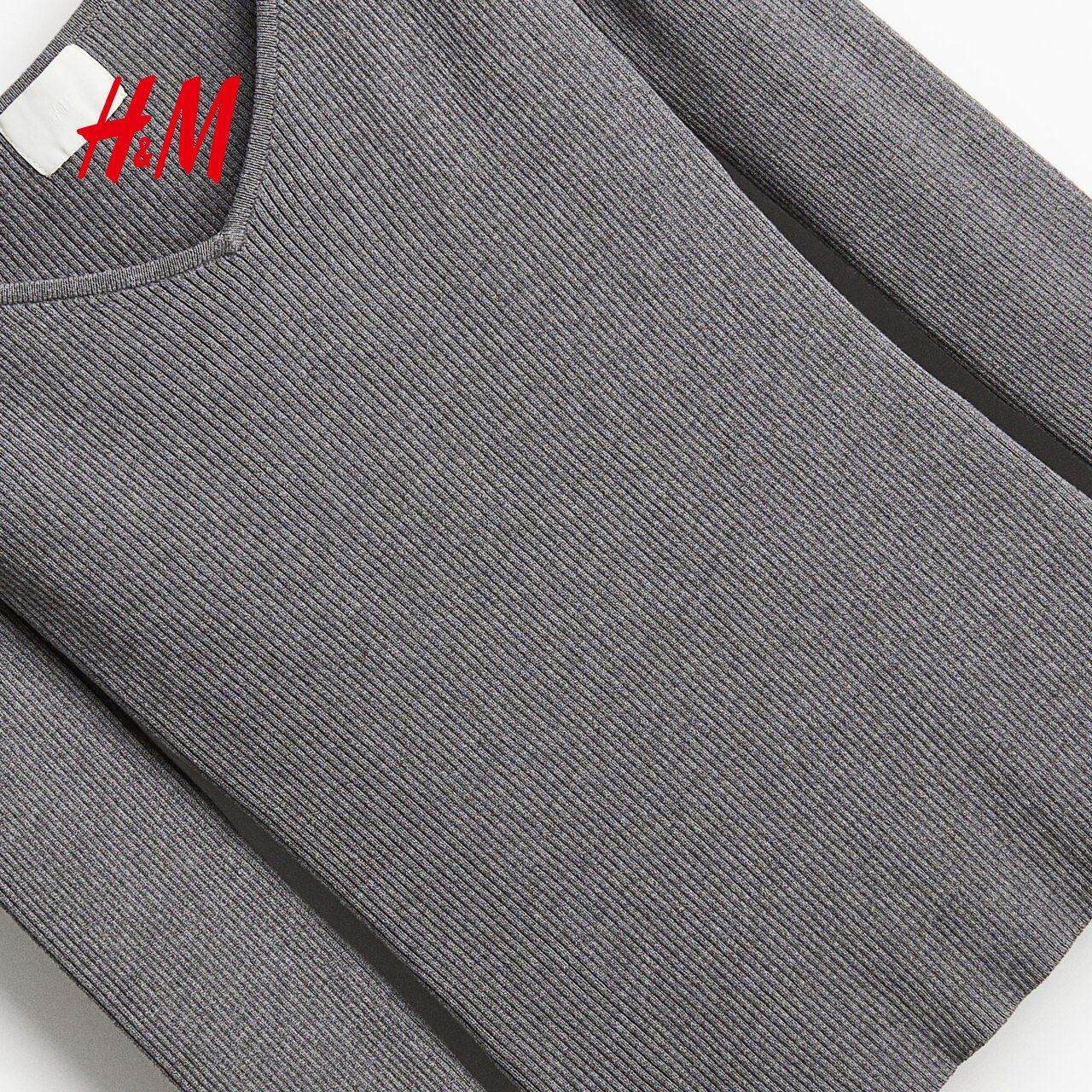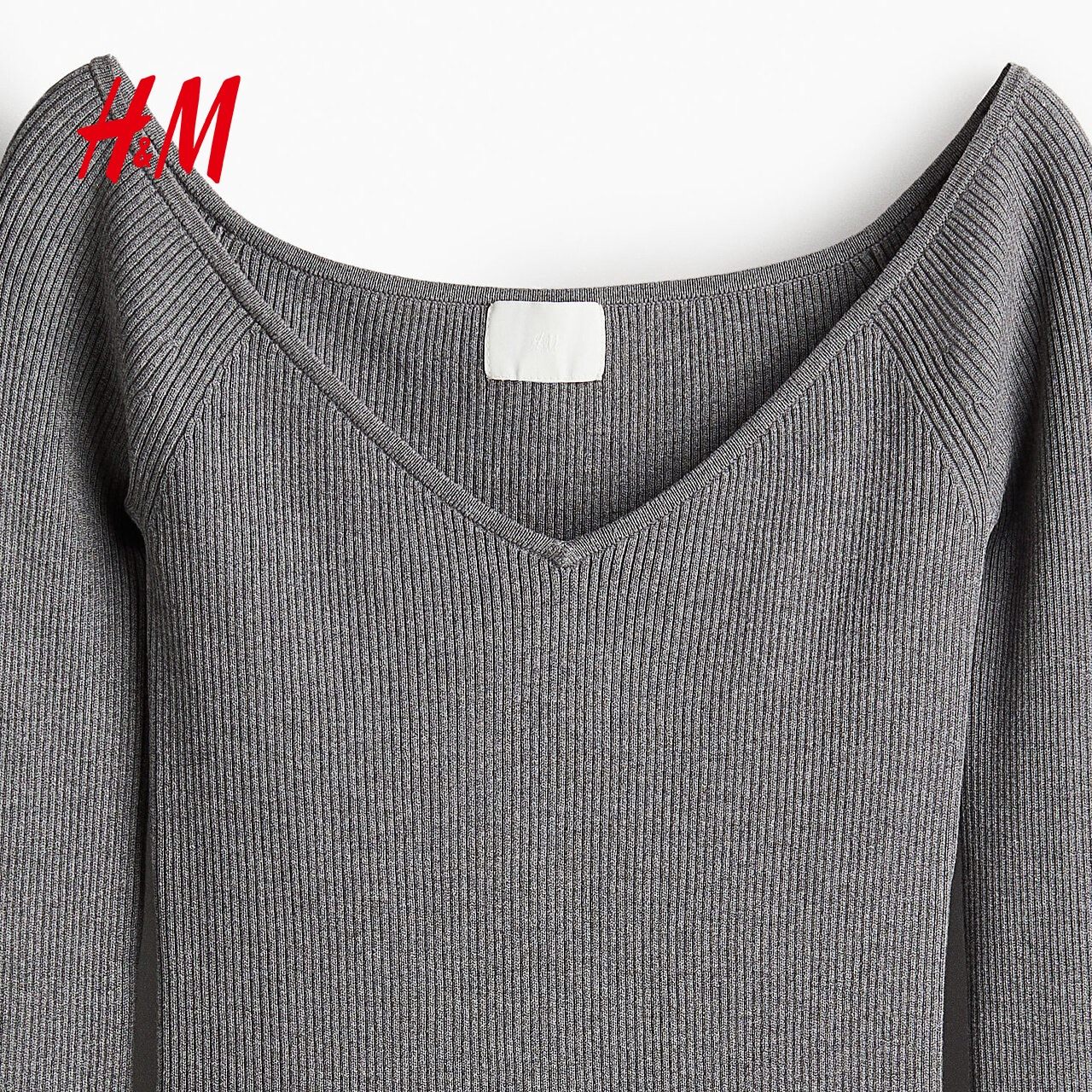 HM女装毛针织衫冬季修身露肩罗纹针织V领长袖上衣1239454