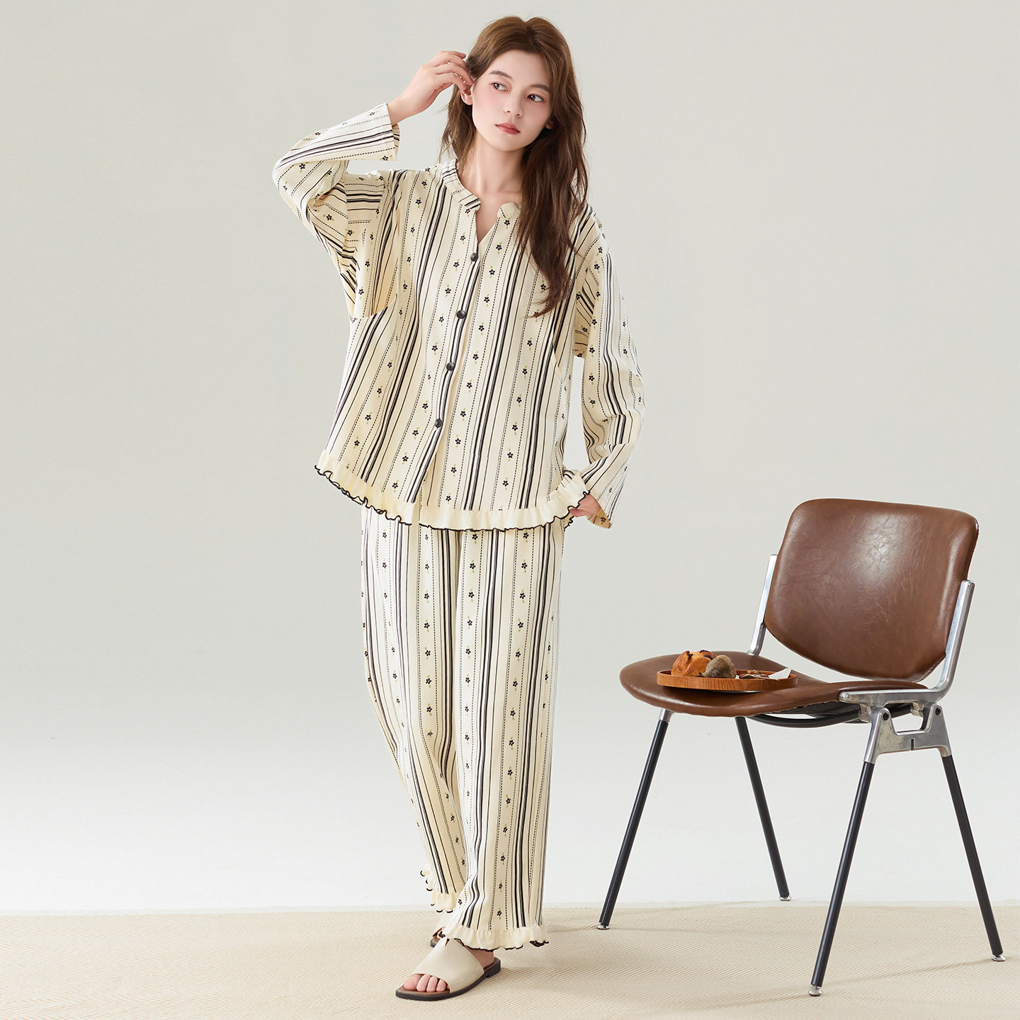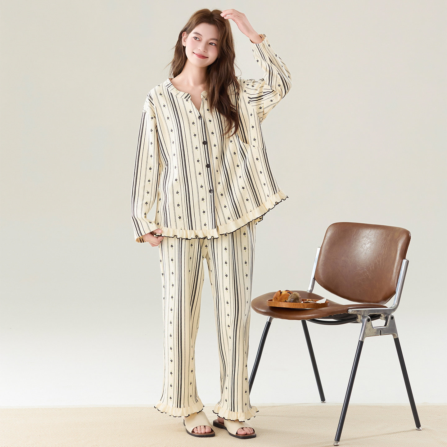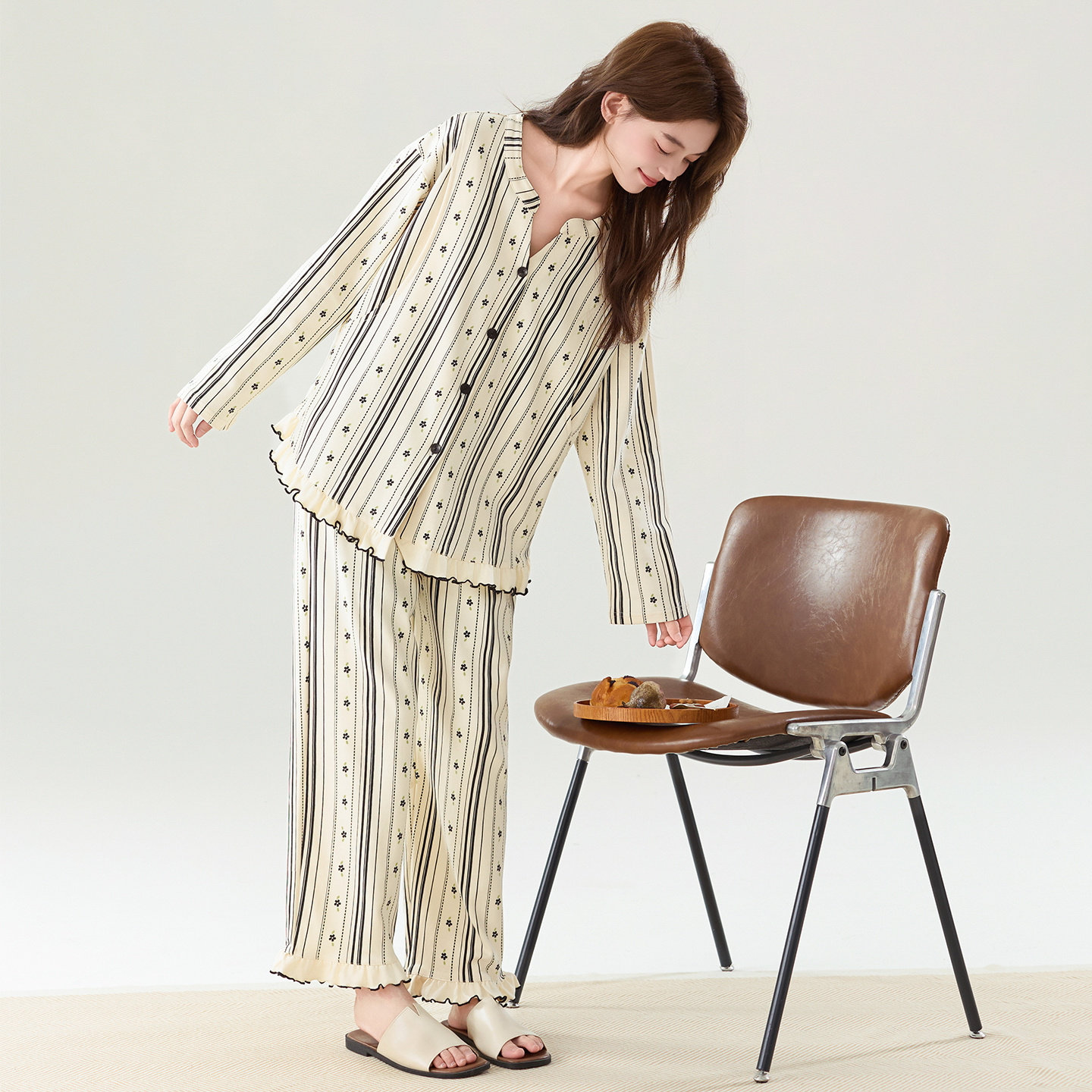 都市丽人新款休闲风纯棉睡衣女V领月子服产后喂奶哺乳家居服套装