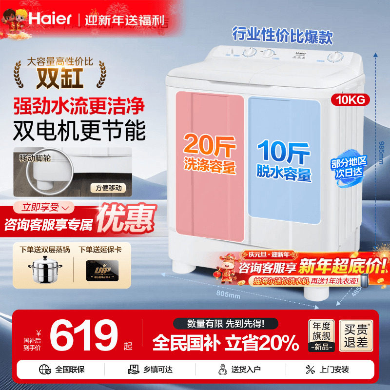 海尔洗衣机家用半自动10公斤超大容量双桶租房老式双缸波轮旗舰店