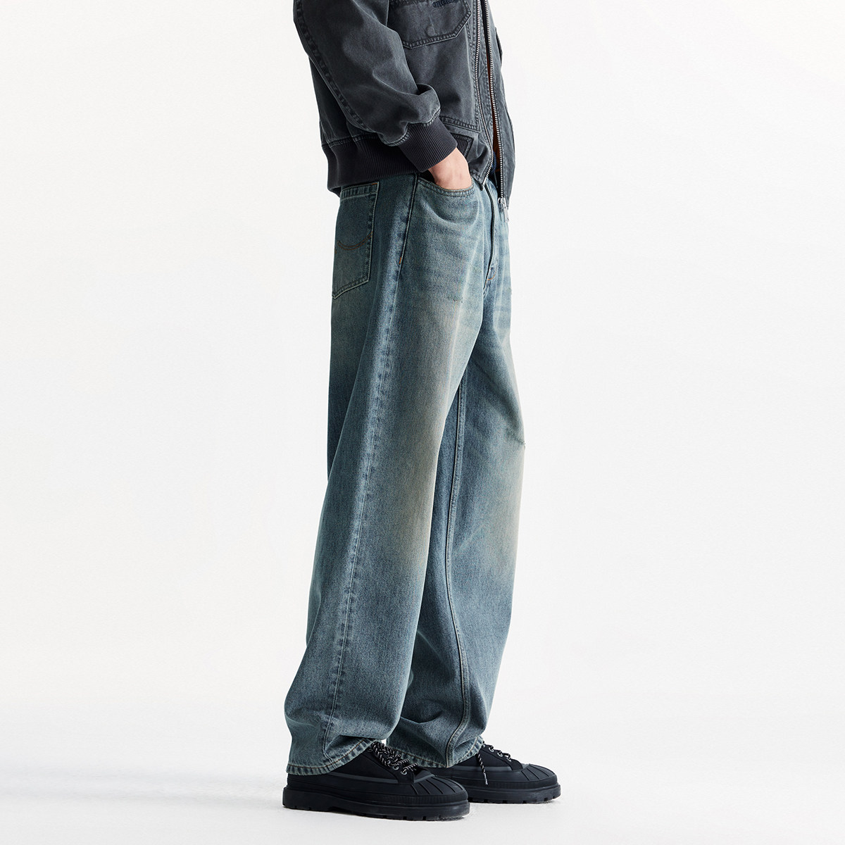 王安宇同款森马牛仔裤男做旧复古阔感弯刀裤宽松弧形裤2025冬新款