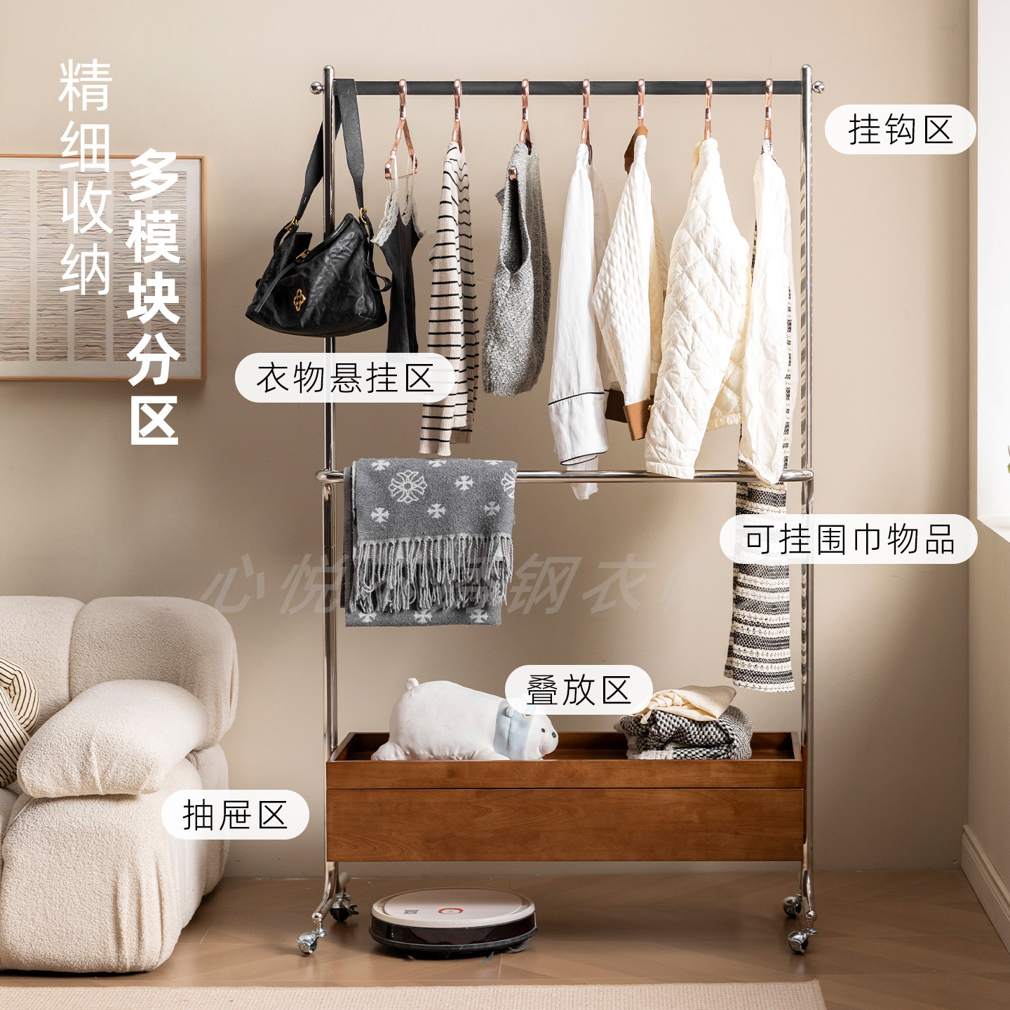 高端不锈钢衣帽架落地可移动带实木抽屉收纳轻奢卧室挂衣架置物架
