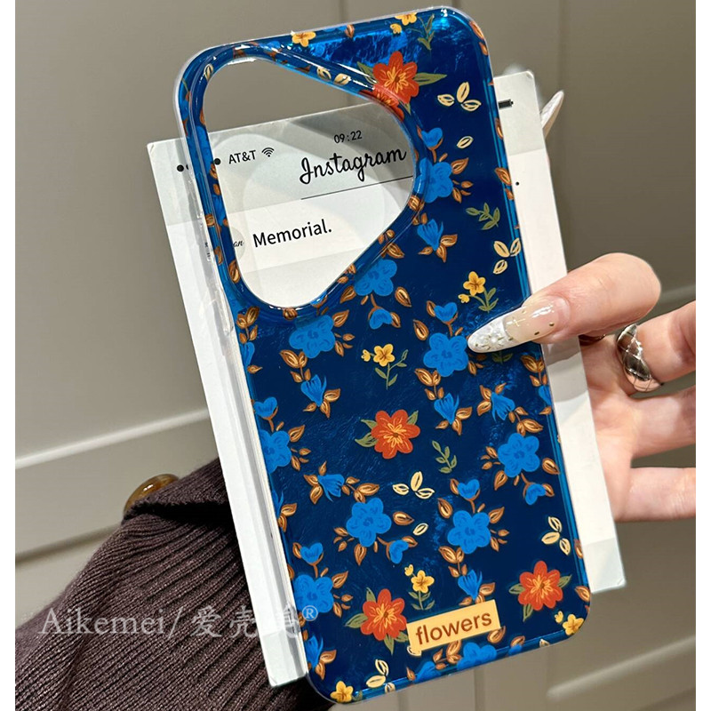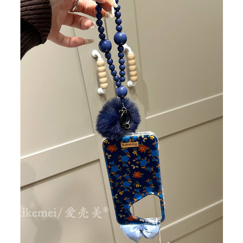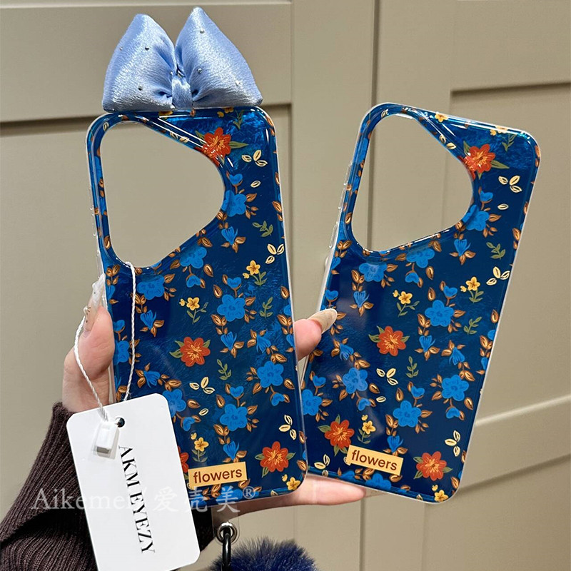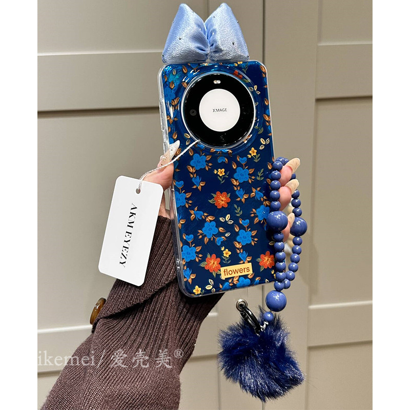 适用华为pura80pro+手机壳ins小清新克莱因蓝油画小碎花Pura70顶部蝴蝶结p70pro毛球挂件手环mate60pro男女款