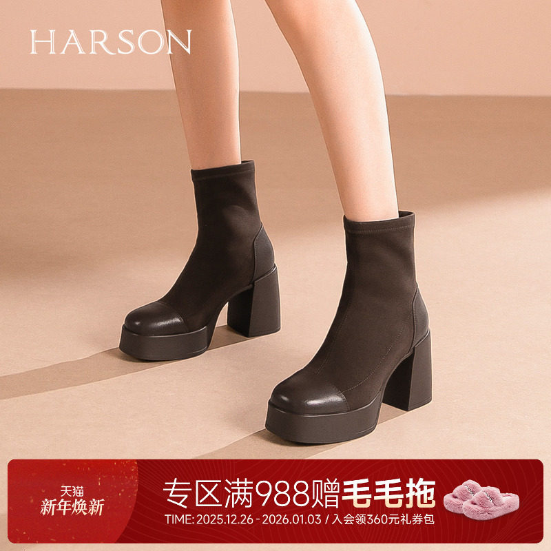 哈森/HARSON【时髦假日】25冬新款粗高跟弹力瘦瘦靴增高女短靴