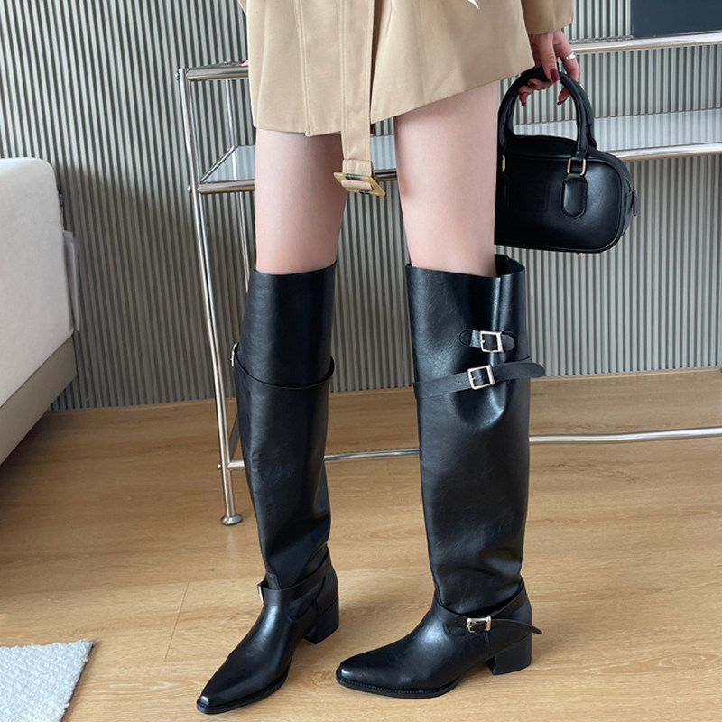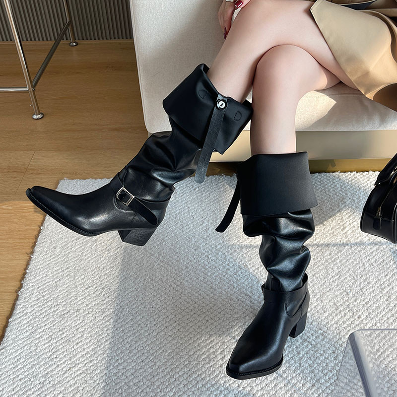 真皮~骄屿复古皮带扣粗跟长筒靴不过膝显瘦骑士靴尖头褶皱堆堆靴