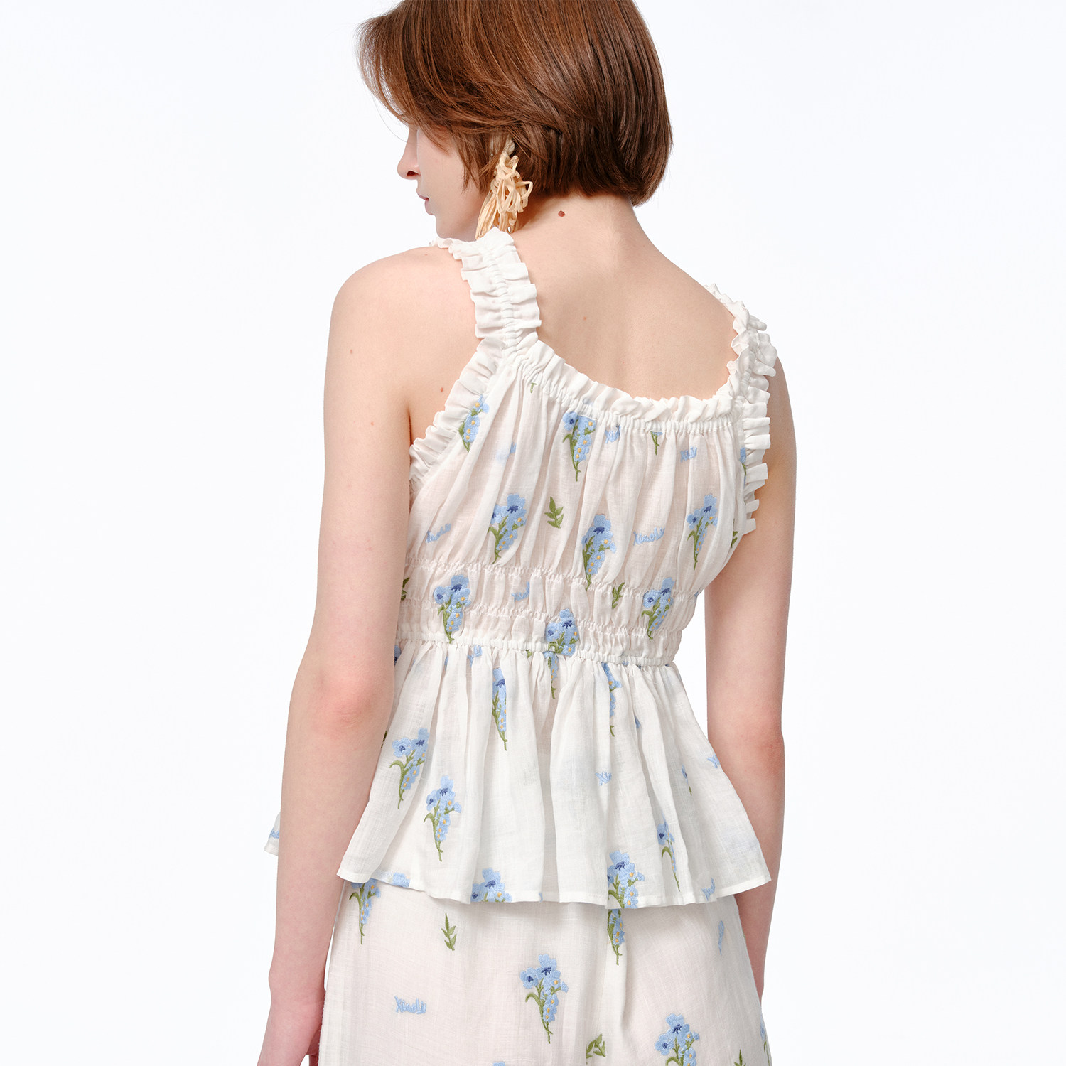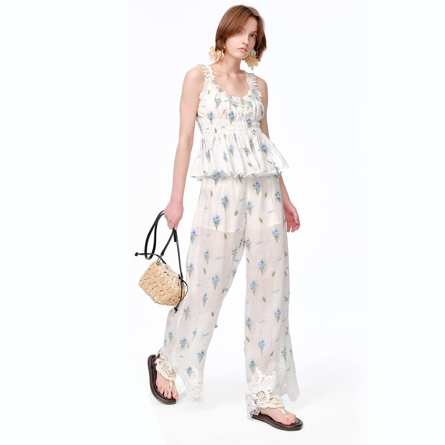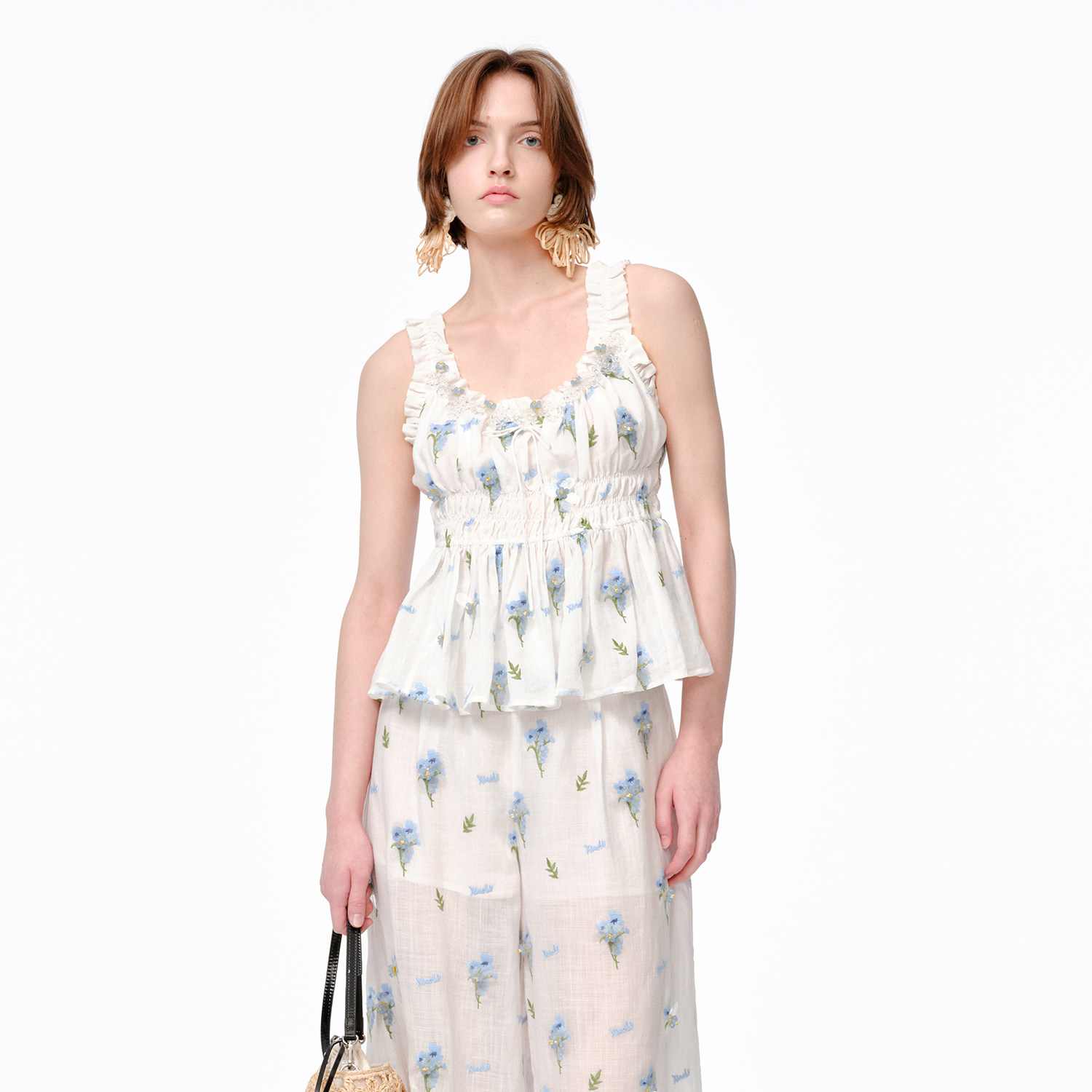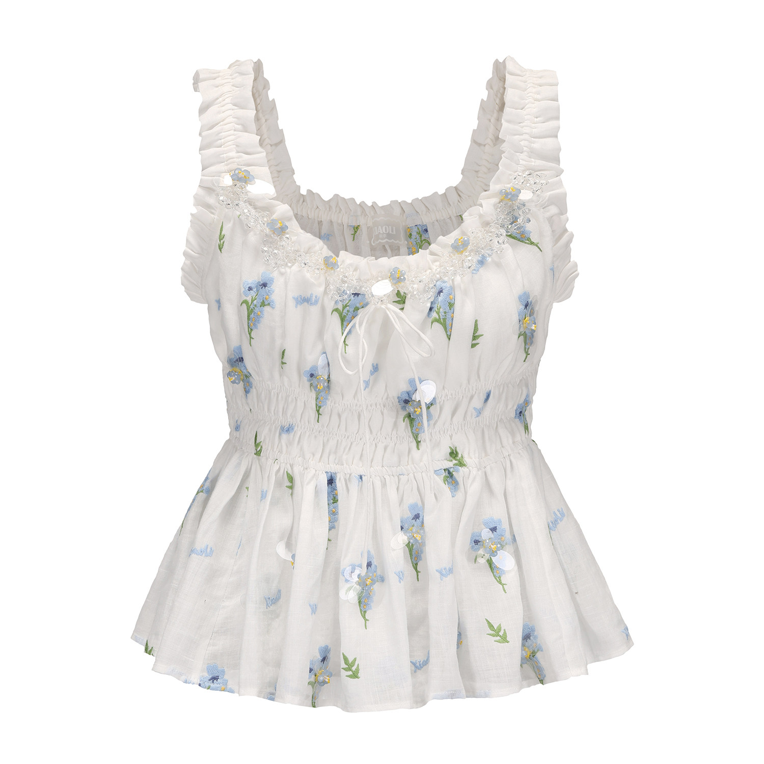 XIAOLI筱李 25春夏白色蕾丝蓝碎花刺绣钉珠短上衣