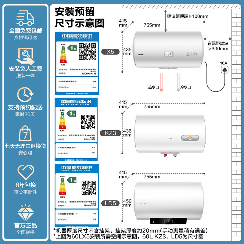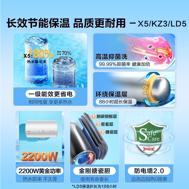 海尔出品统帅电热水器家用小型一级能效60升速热节能租房洗澡X5