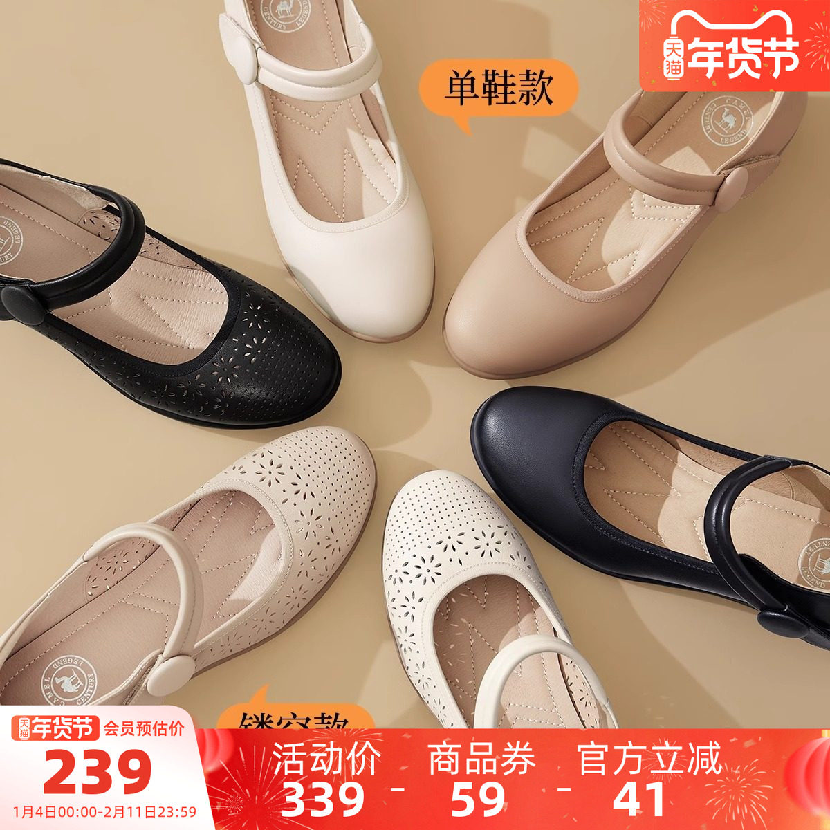 骆驼女鞋2025秋季牛皮玛丽珍妈妈鞋坡跟镂空真皮单鞋女小皮鞋