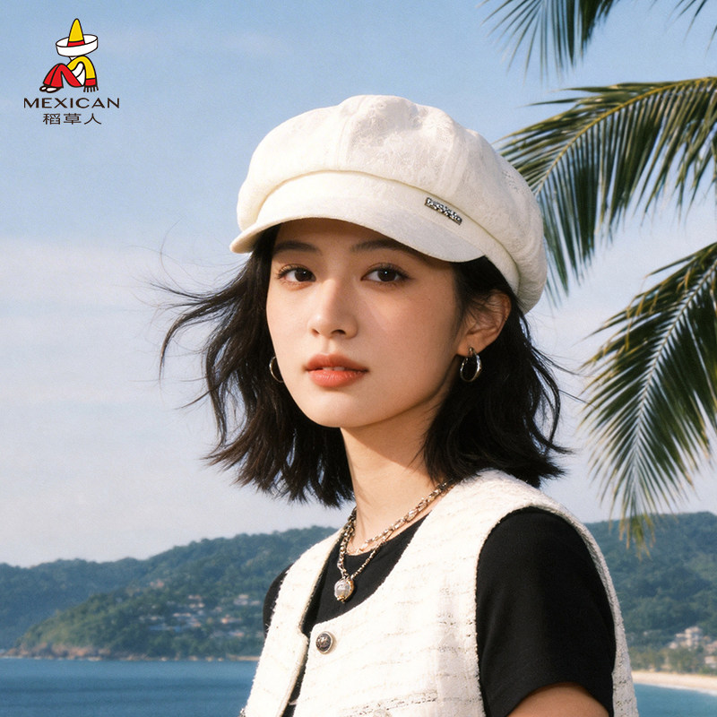 稻草人韩版复古黑色八角帽女春夏百搭显脸小报童帽大头围贝雷帽