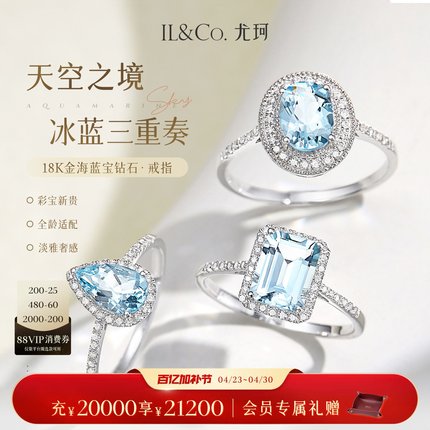 ILCO尤珂「冰蓝方糖」18K金天然海蓝宝石戒指时尚方形彩宝女款戒