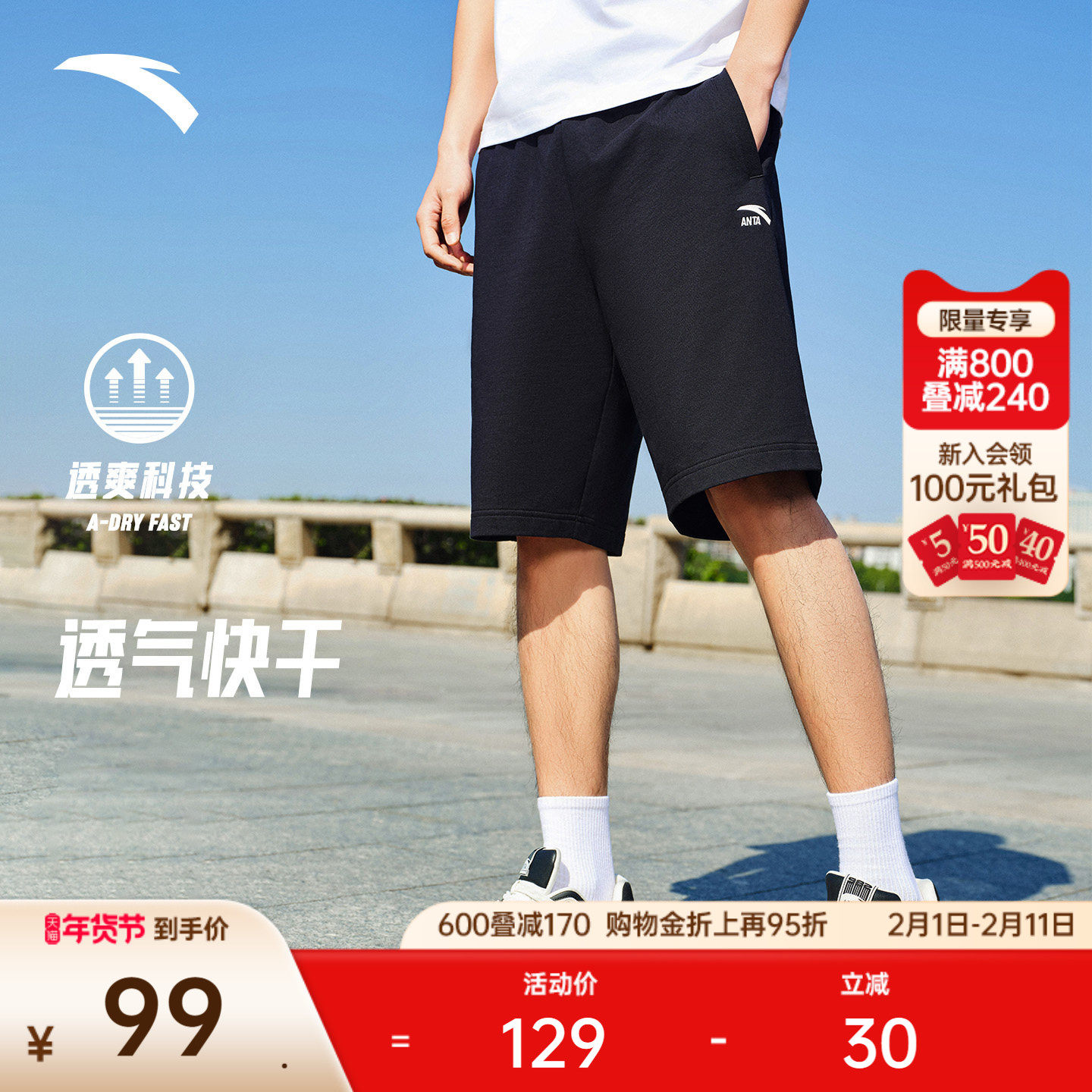 安踏针织运动短裤男士夏季快干棉宽松透气简约美式休闲百搭五分裤