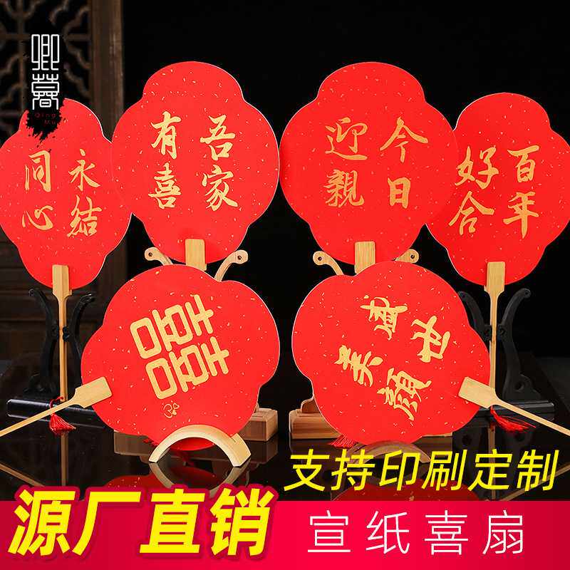 新款直销中国风婚礼用四瓣金色伴娘团扇新娘喜扇长柄古风双喜结婚