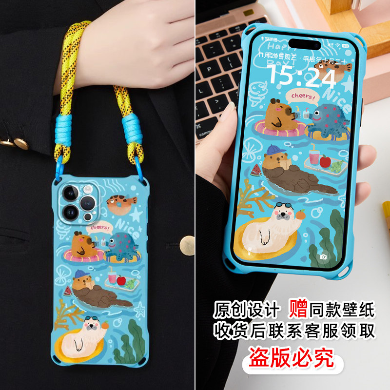海洋动物适用苹果17promax蓝色手机壳磁吸16带挂绳iphone13背带可调节15斜跨可背12全包防摔14手提女款x夏日