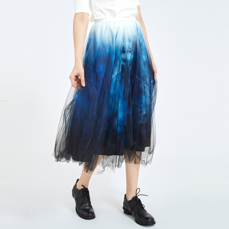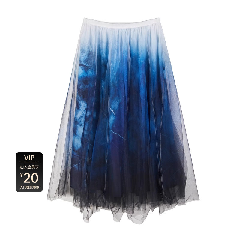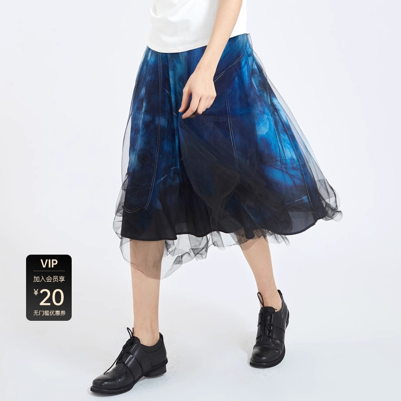 sdeer圣迪奥女装秋优雅松紧扎染印花网纱拼接A字长裙S21181101