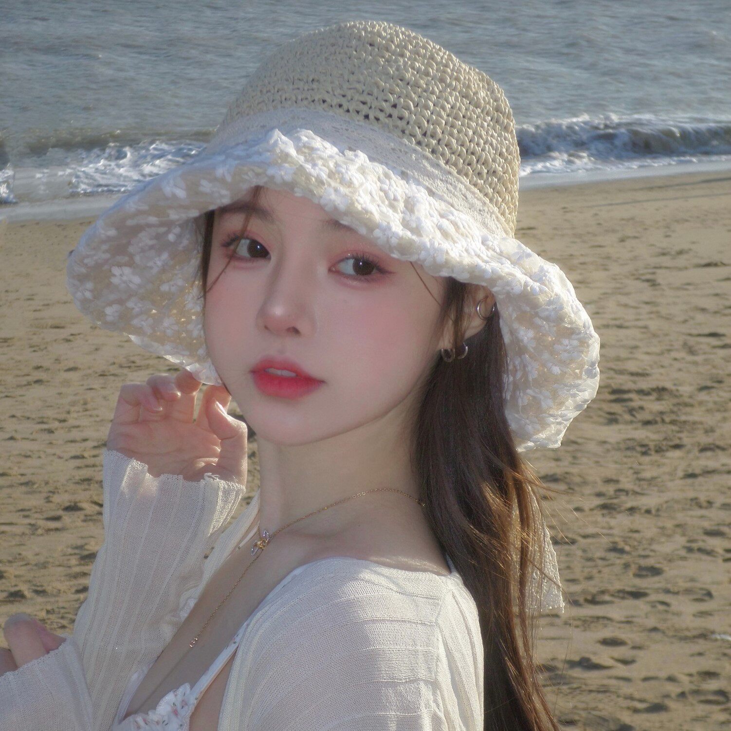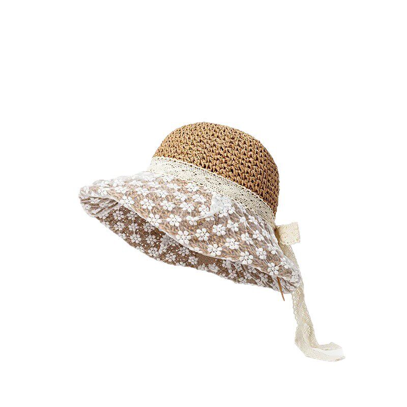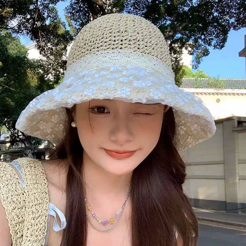 蕾丝花朵大草帽海边沙滩女士渔夫帽防晒防紫外线遮阳度假海边度假