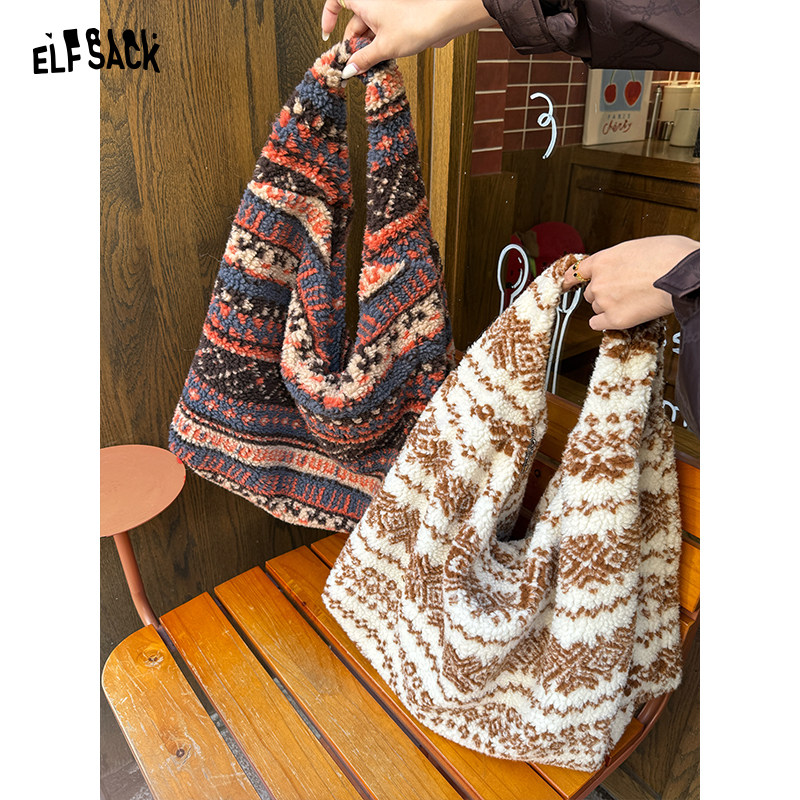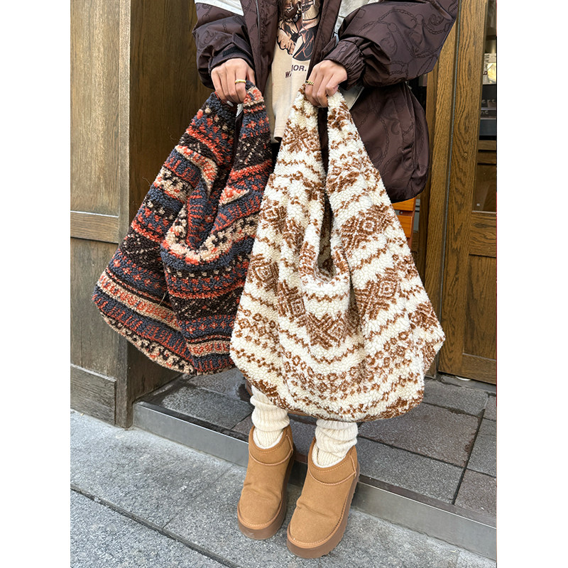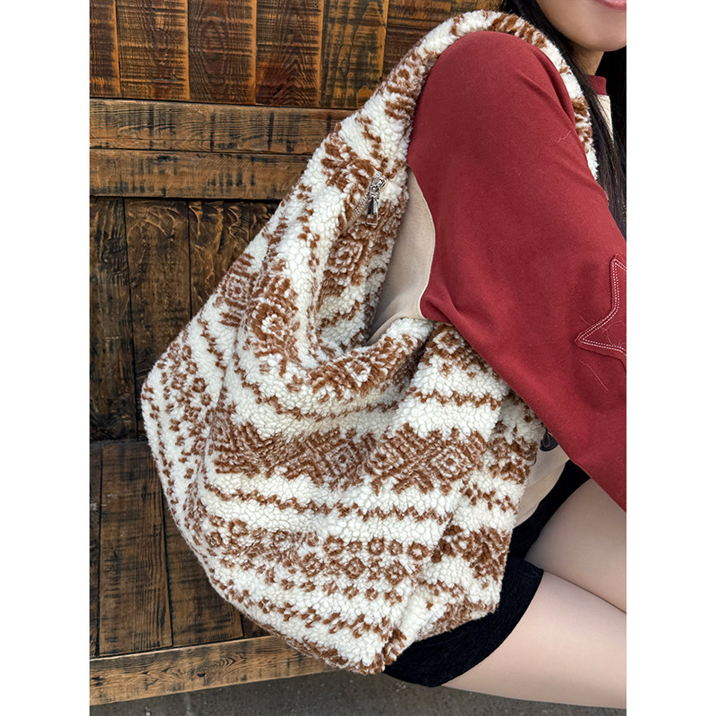 妖精的口袋民族风毛绒绒单肩包女2025年新款大容量百搭通勤托特包