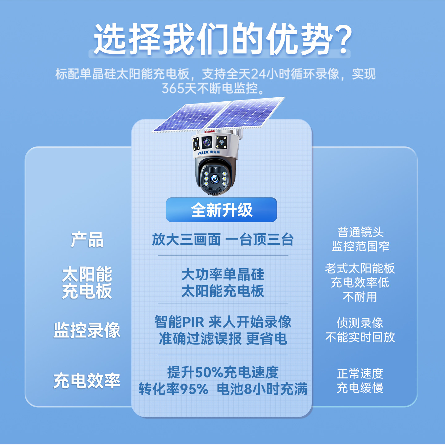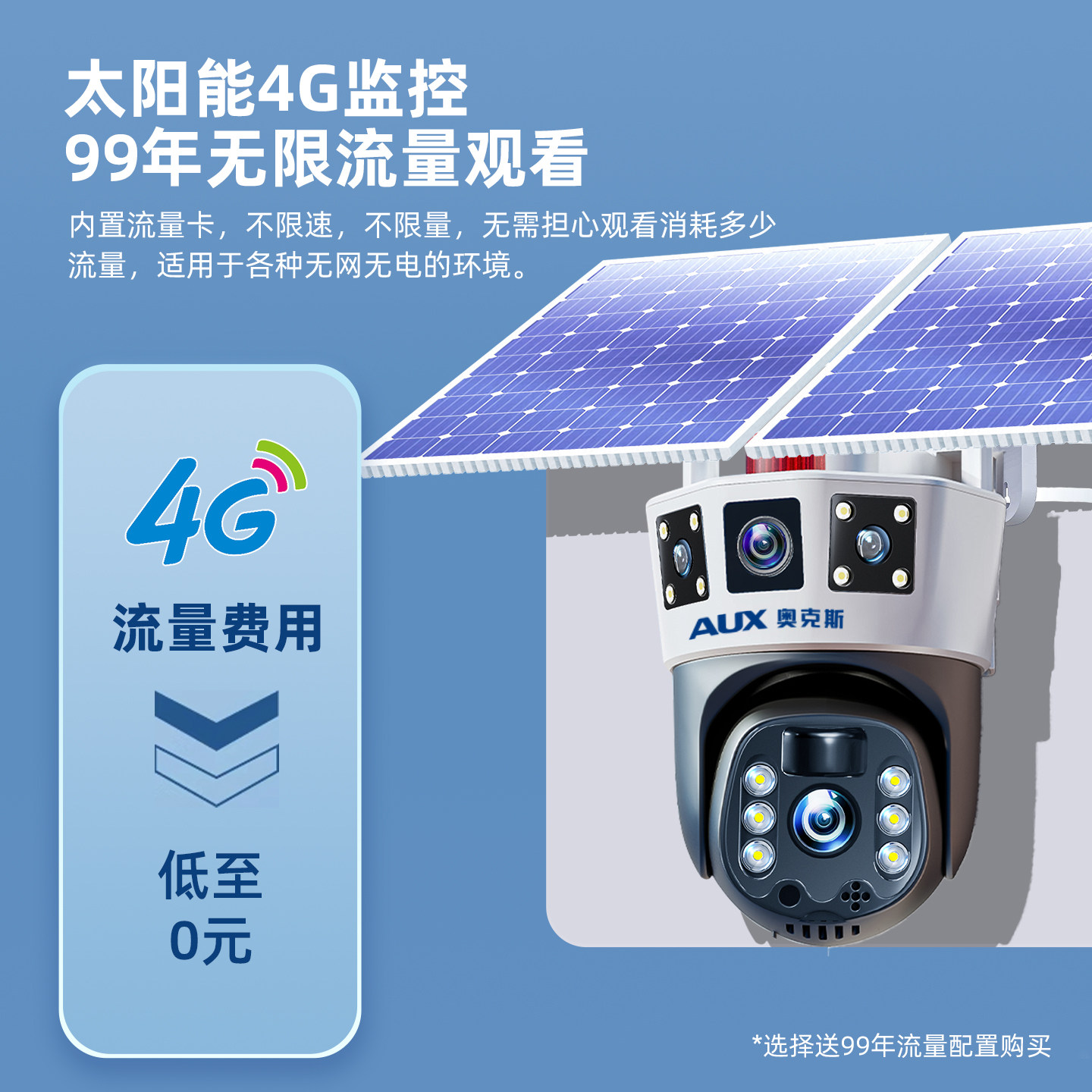 奥克斯4G太阳能监控摄像头360度无死角手机远程室外高清无网无电