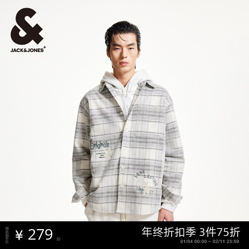 杰克琼斯男装秋季字母刺绣背后印花衣身格纹宽松舒适百搭时尚衬衫