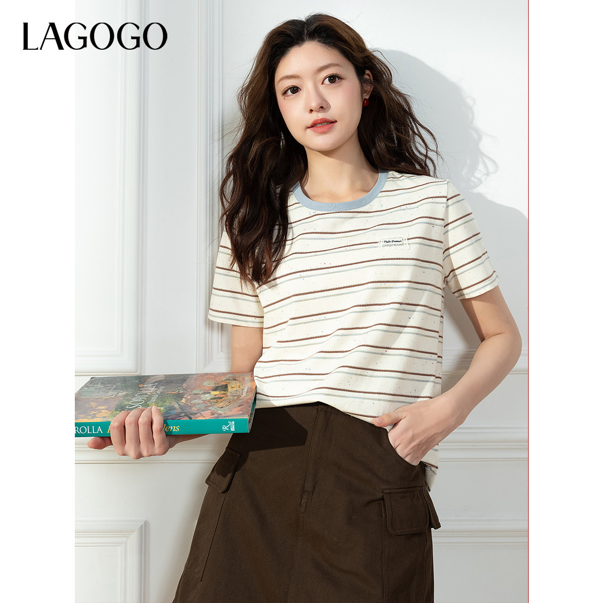 LAGOGO彩点条纹短袖T恤女拉谷谷2026春季新款元气通勤圆领上衣