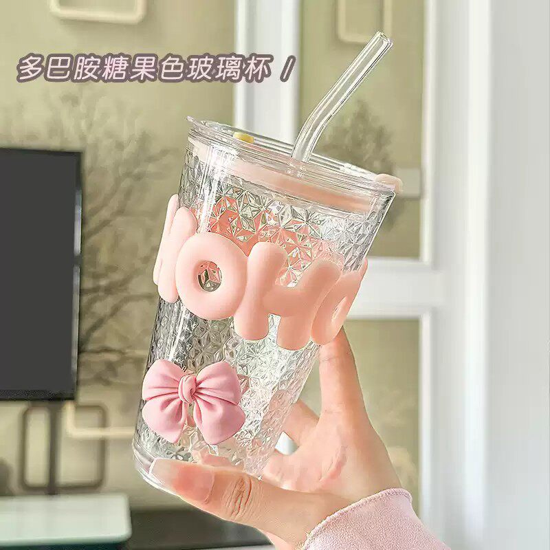 玻璃杯子ins高颜值喝水杯女生吸管杯粉色蝴蝶结透明蓝色大容量