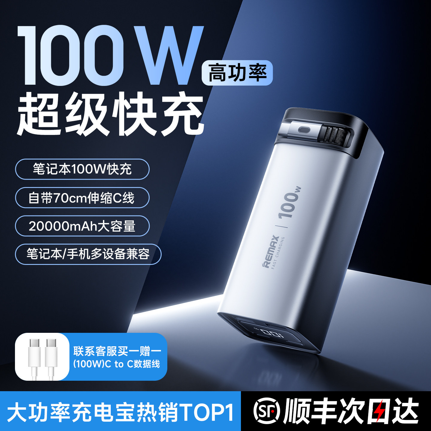 【新国标3C认证】remax睿量2026新款充电宝20000毫安自带线100W大功率笔记本电脑快充大容量可上飞机适用苹果