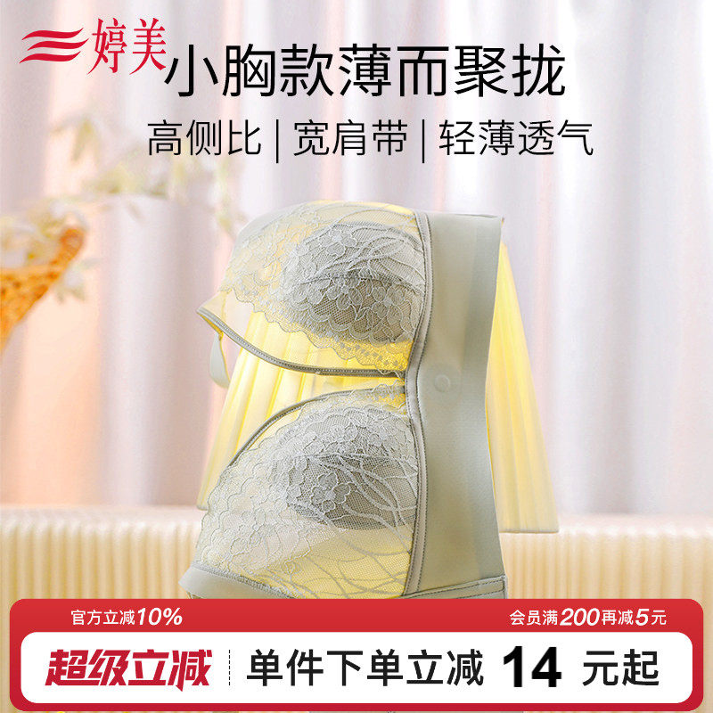 婷美薄款蕾丝兔耳朵大胸显小内衣收副乳调整型防下垂无钢圈文胸女