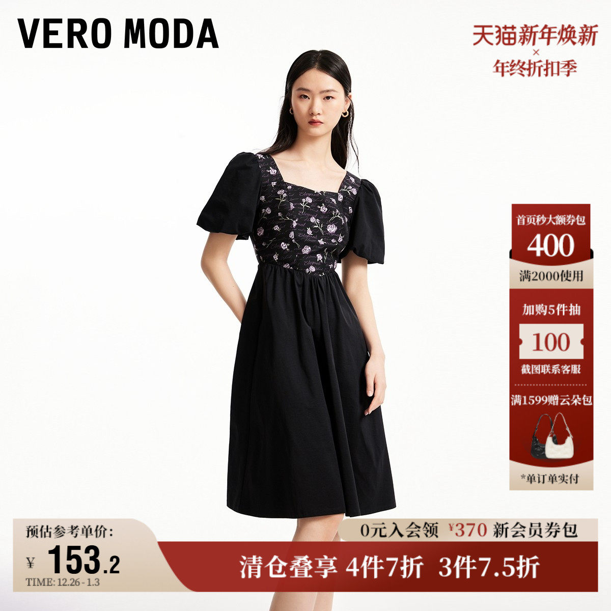 Vero Moda奥莱连衣裙夏季新款甜美优雅玫瑰印花方领泡泡袖裙子
