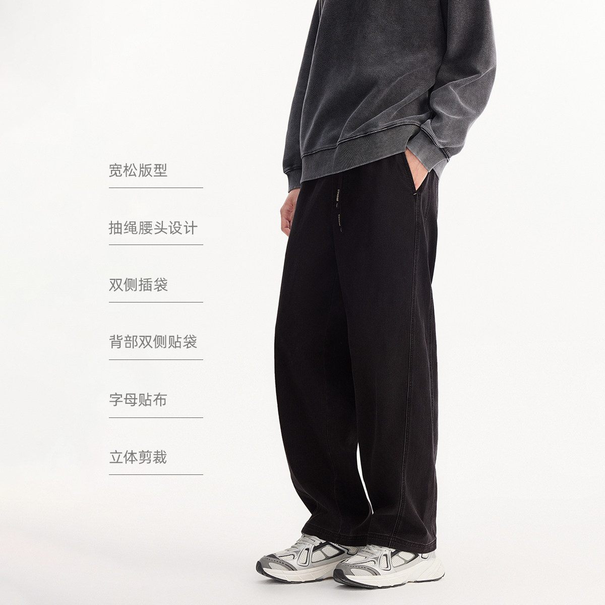 纽扣抽绳双腰头 双侧插袋 背部双侧贴袋