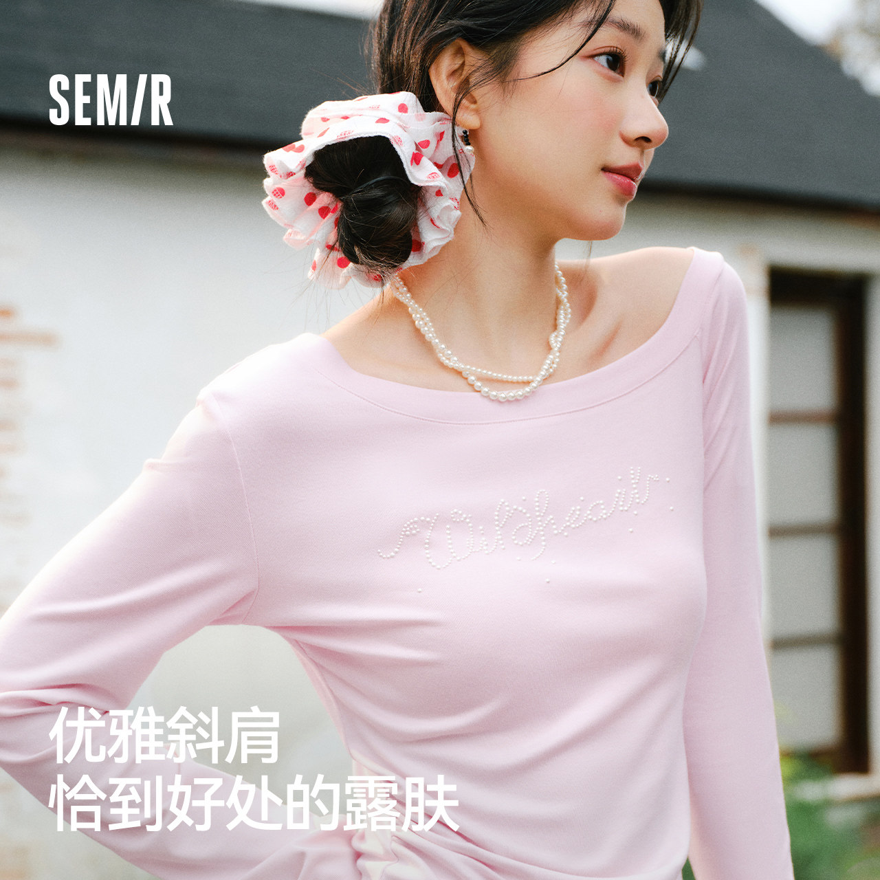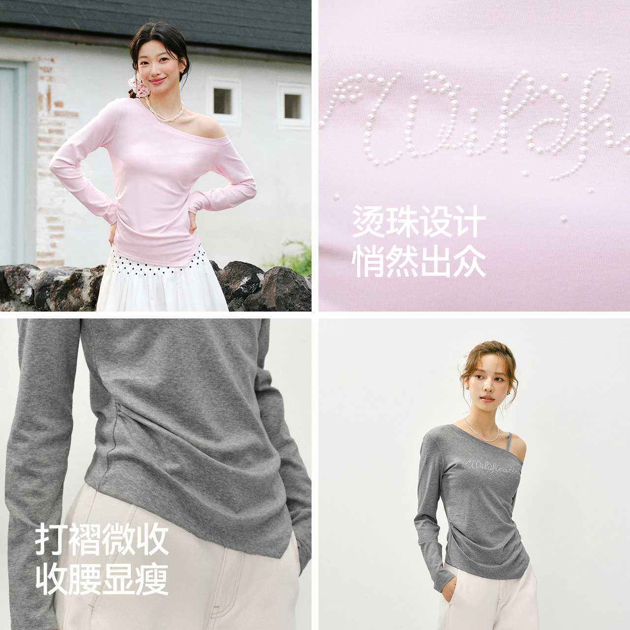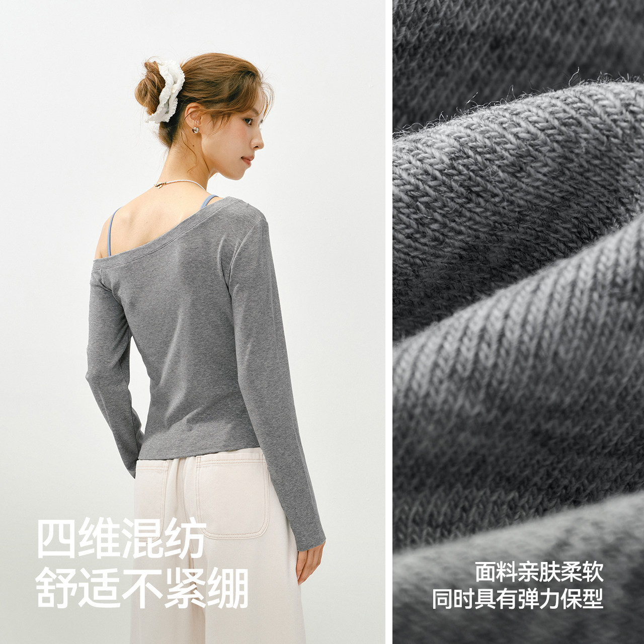 森马长袖T恤女春短款斜肩露肩字母紧身2026新款小性感设计感上衣
