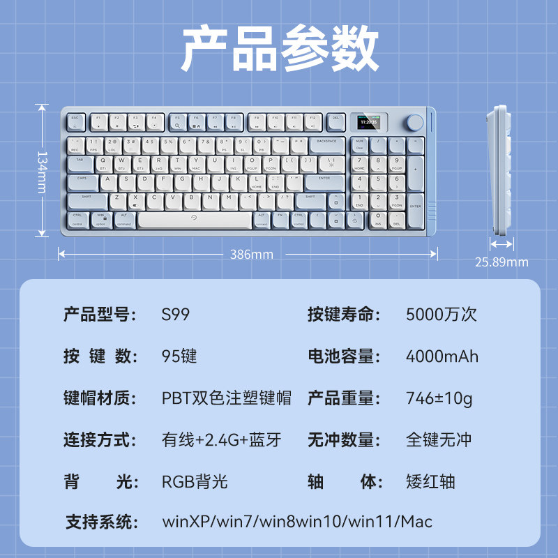 爱国者S99无线蓝牙三模机械键盘矮红轴RGB双色键帽95键全键无冲