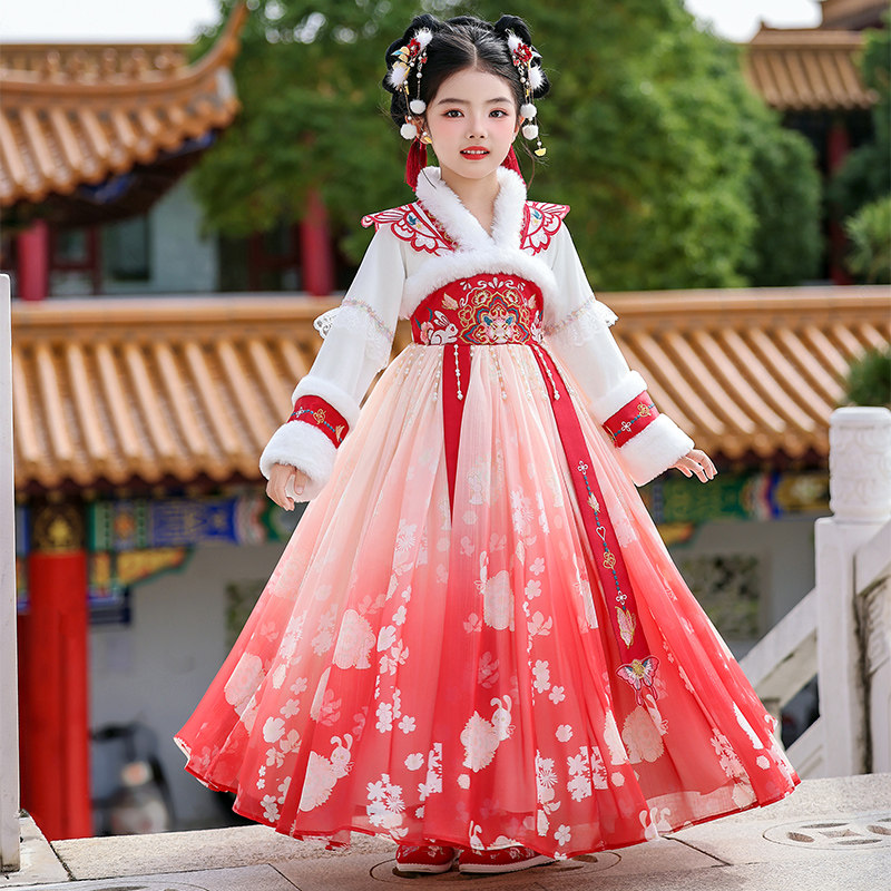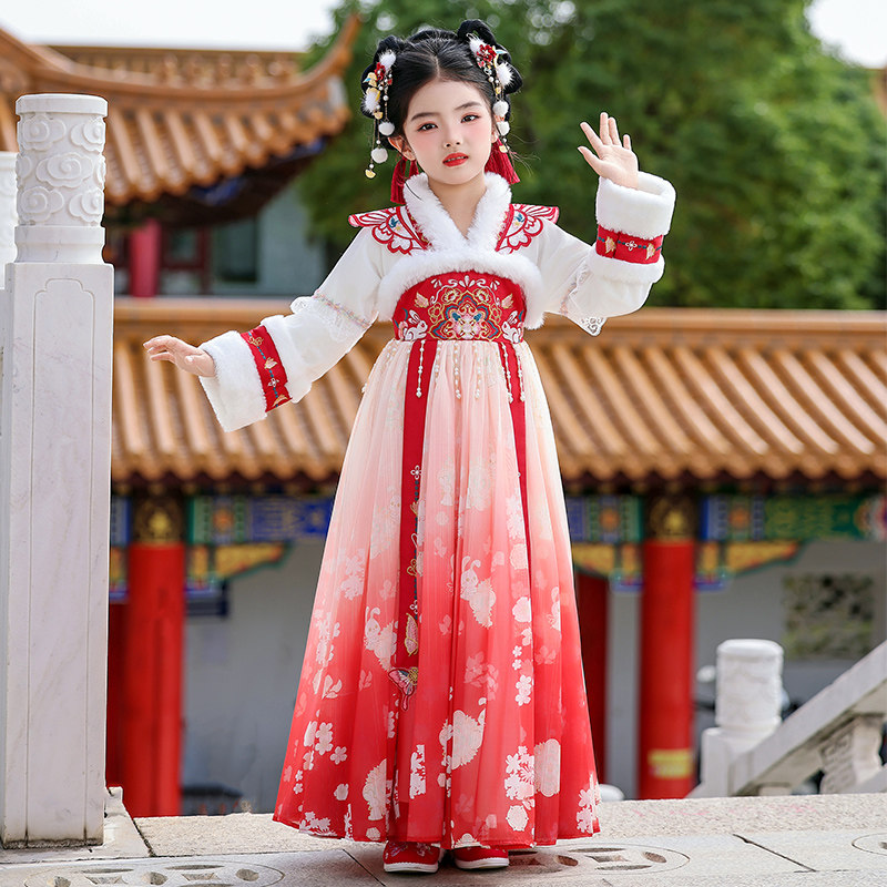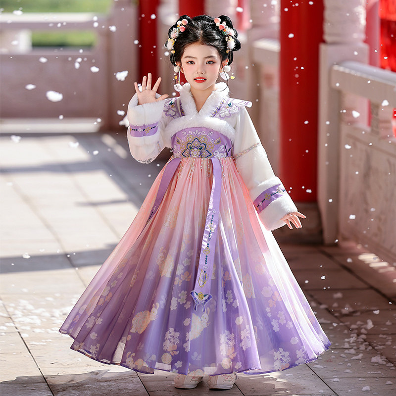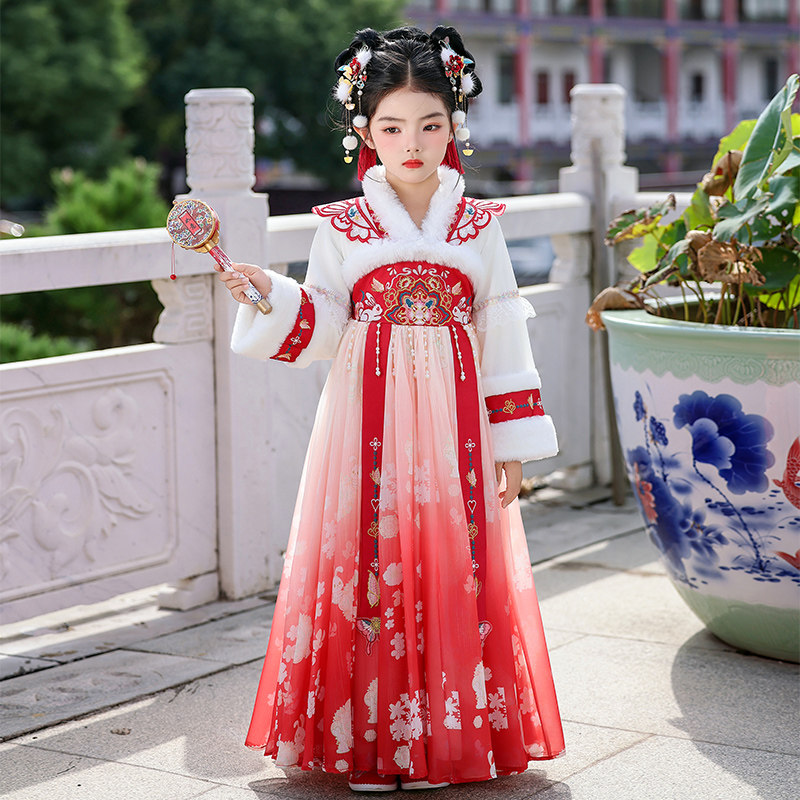 女童汉服冬季古装连衣裙超仙唐装襦裙2025新款加绒加厚新年洋装