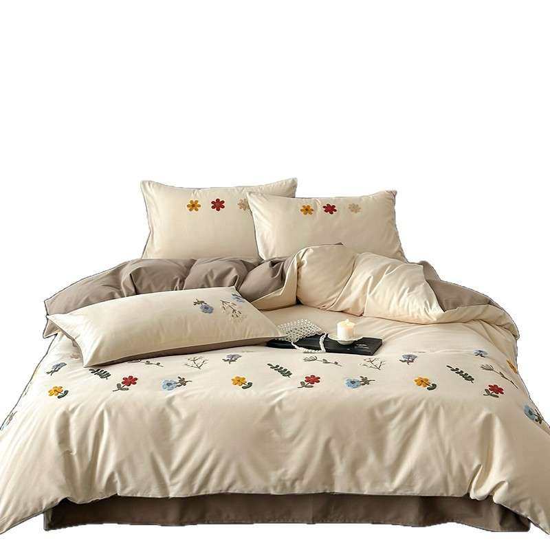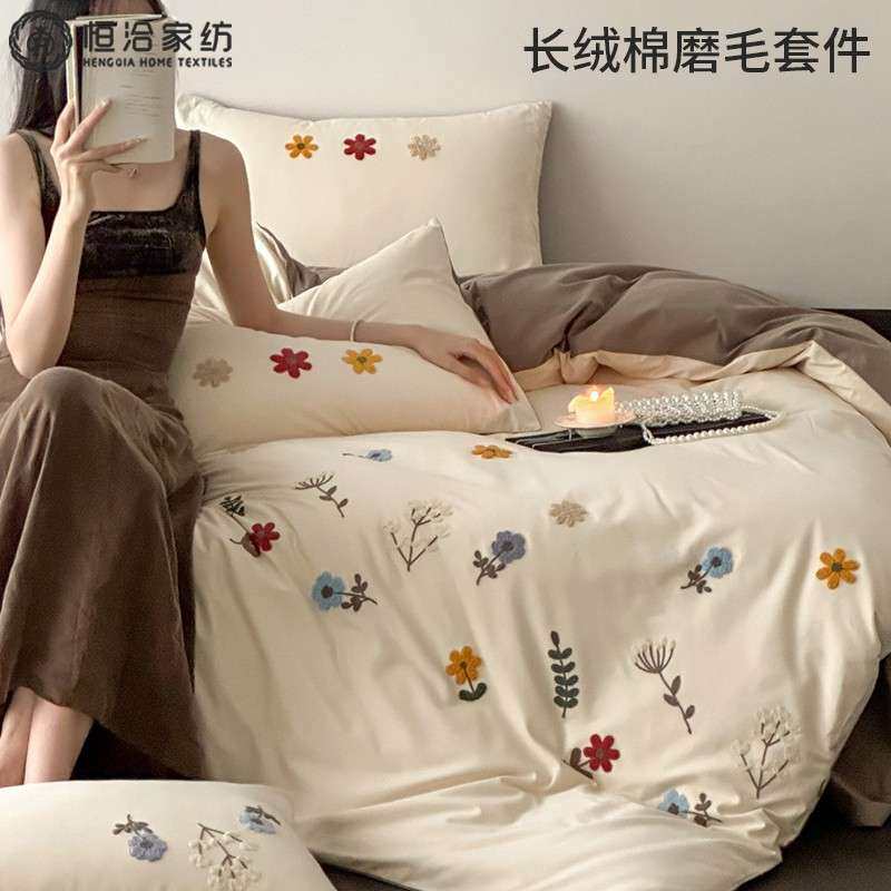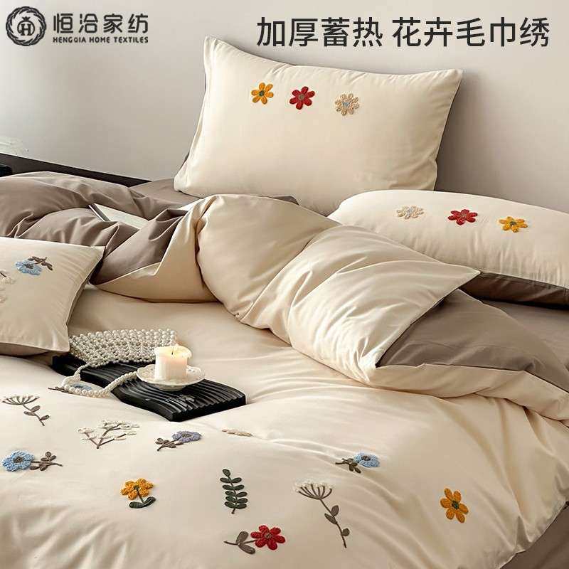 秋冬新款长绒棉磨毛四件套花卉毛巾绣加厚纯棉被套床上用品白咖色
