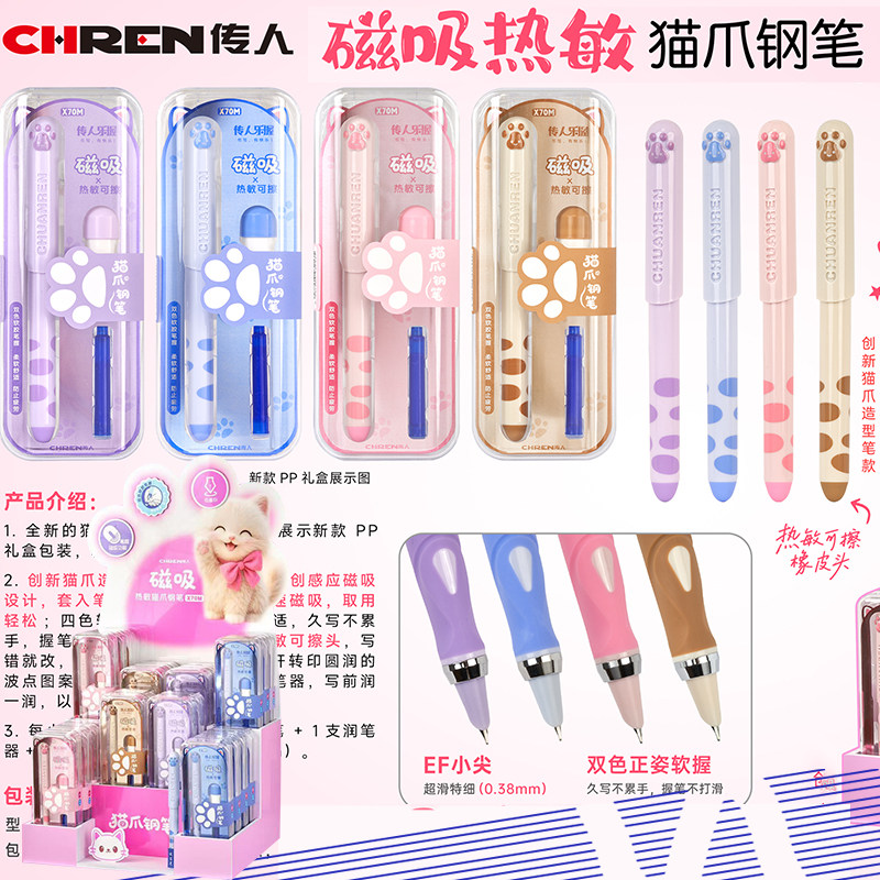 传人可擦钢笔套装猫爪磁吸钢笔三年级学生专用热敏磨摩易可擦钢笔