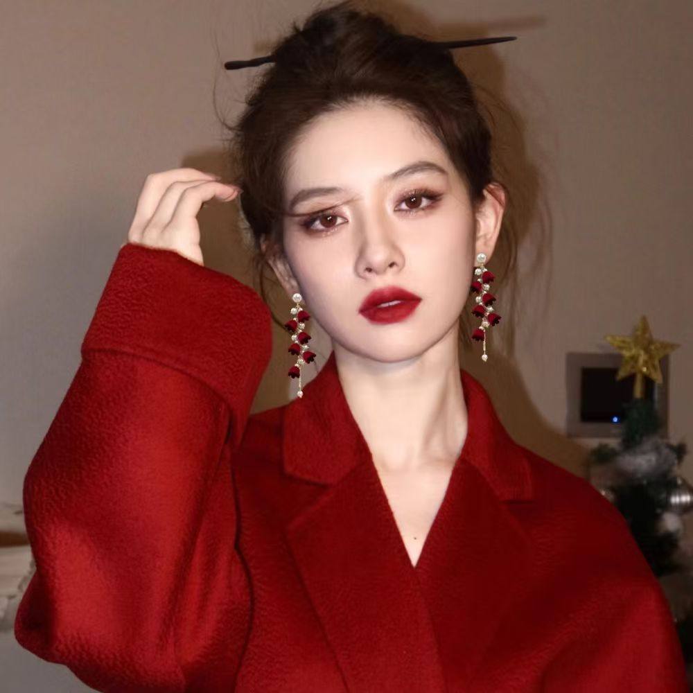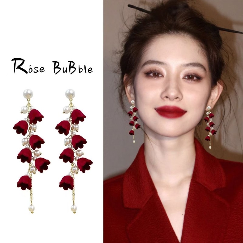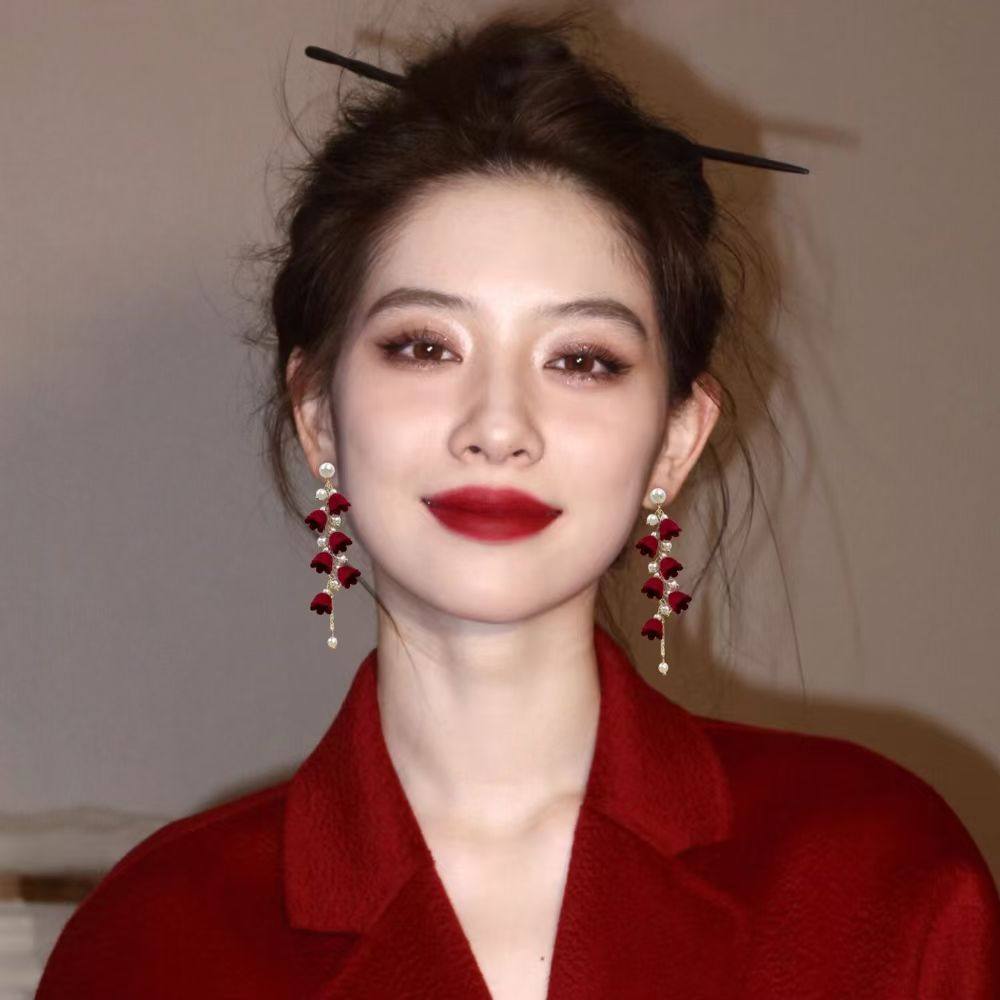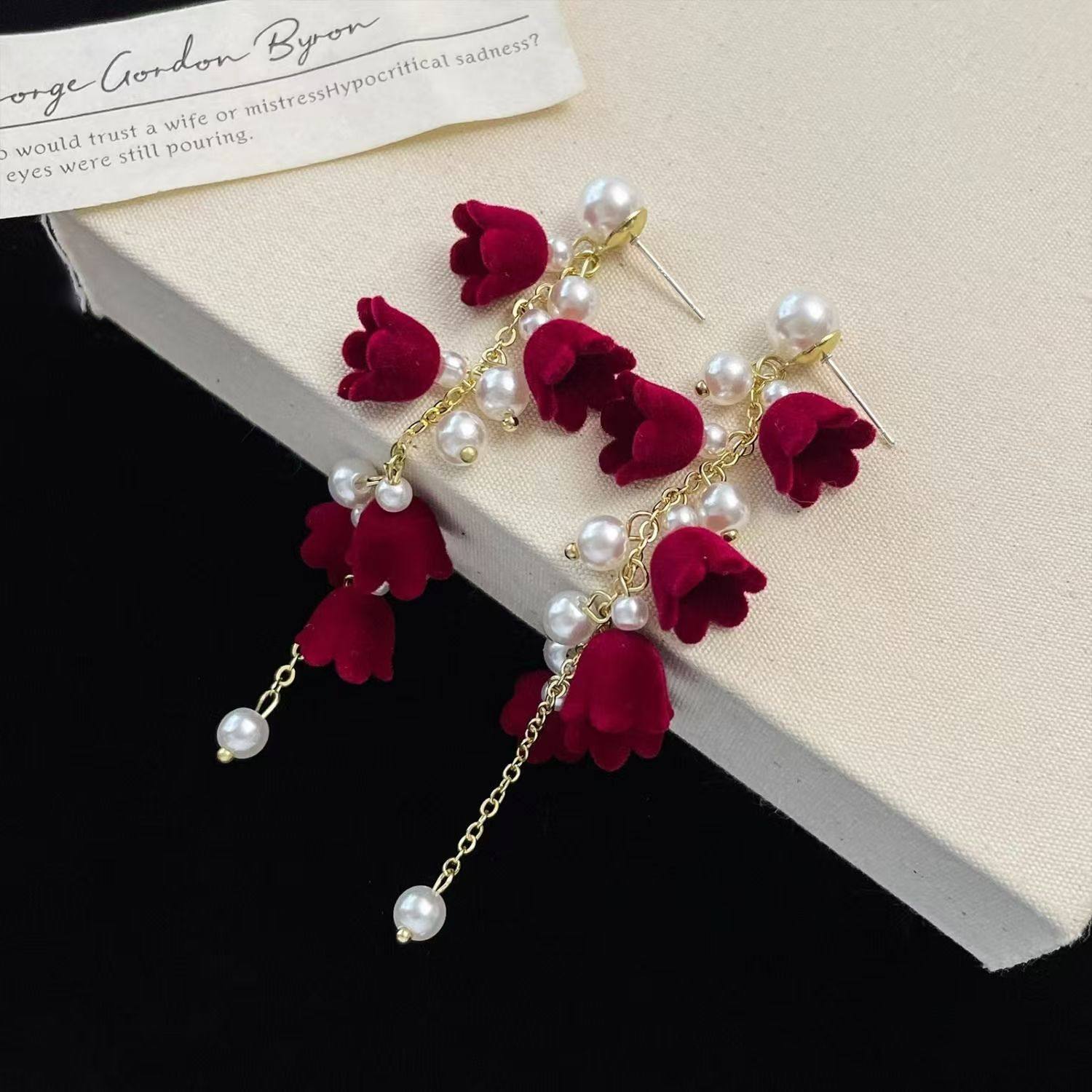 法式铃兰花珍珠耳钉新年高级感敬酒服新娘丝绒耳环秋冬耳饰女红色