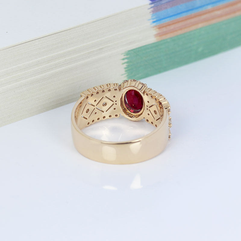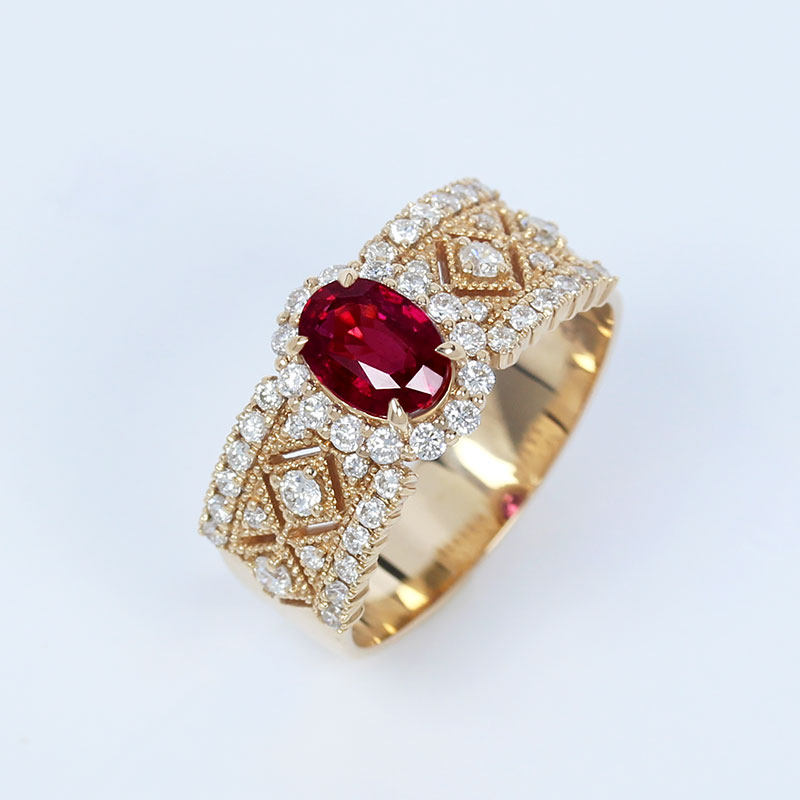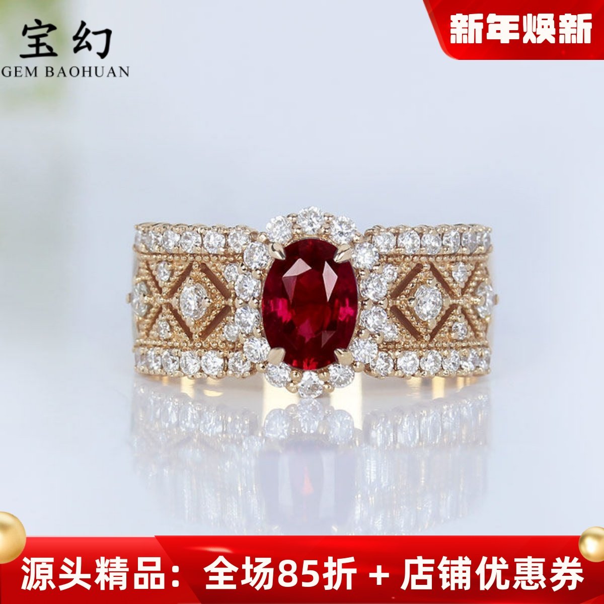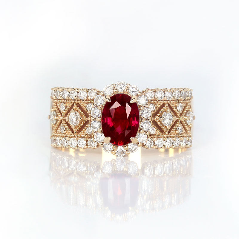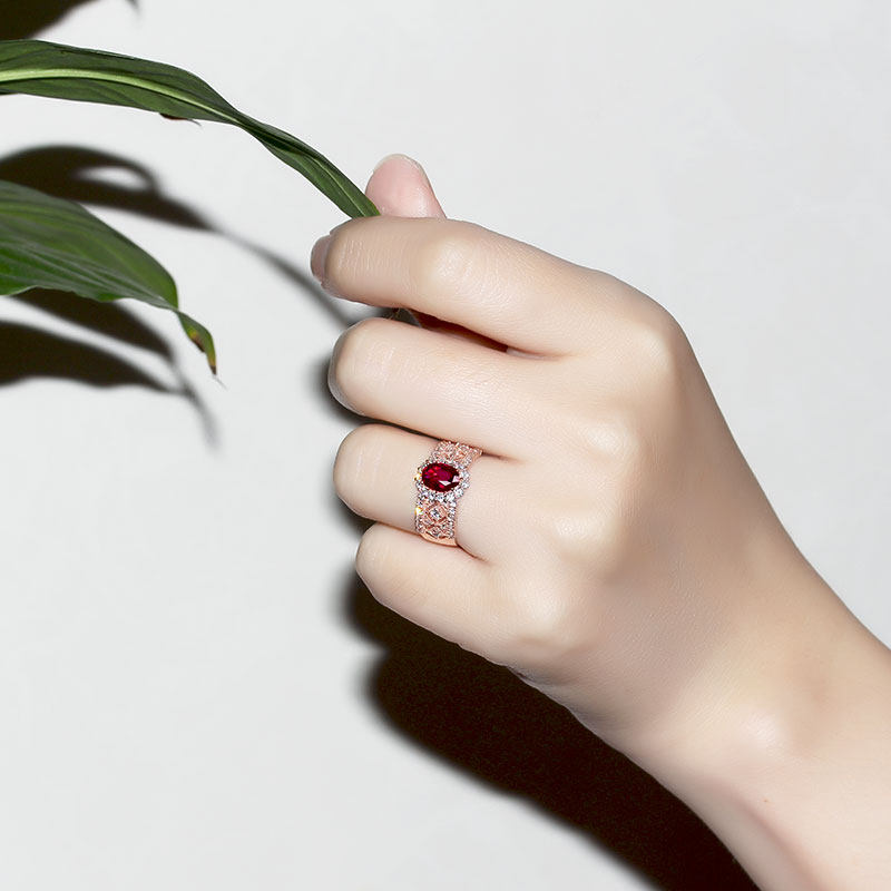 轻奢宽版天然红宝石钻石复古蕾丝大戒指 18K玫瑰金镶钻石女款礼物