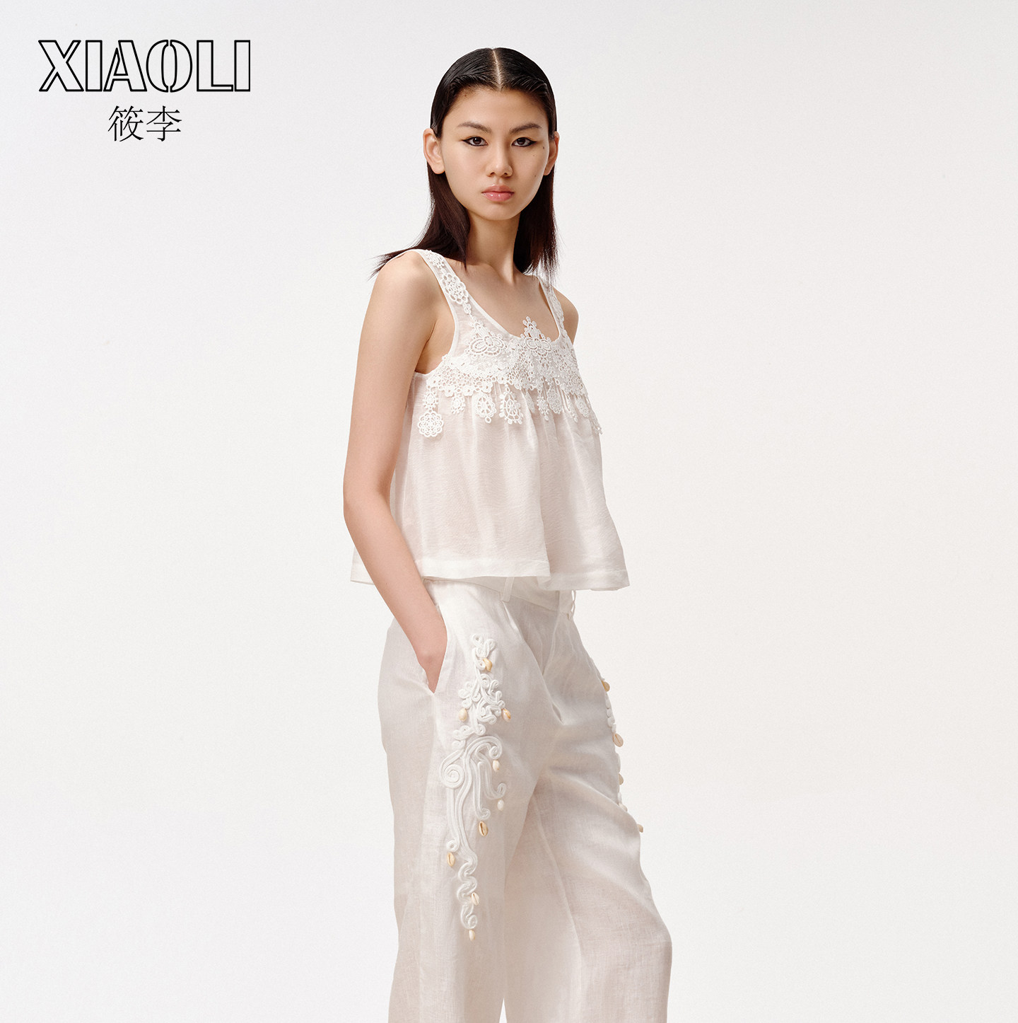 【XIAOLI筱李】百搭白色丝麻蕾丝装饰背心