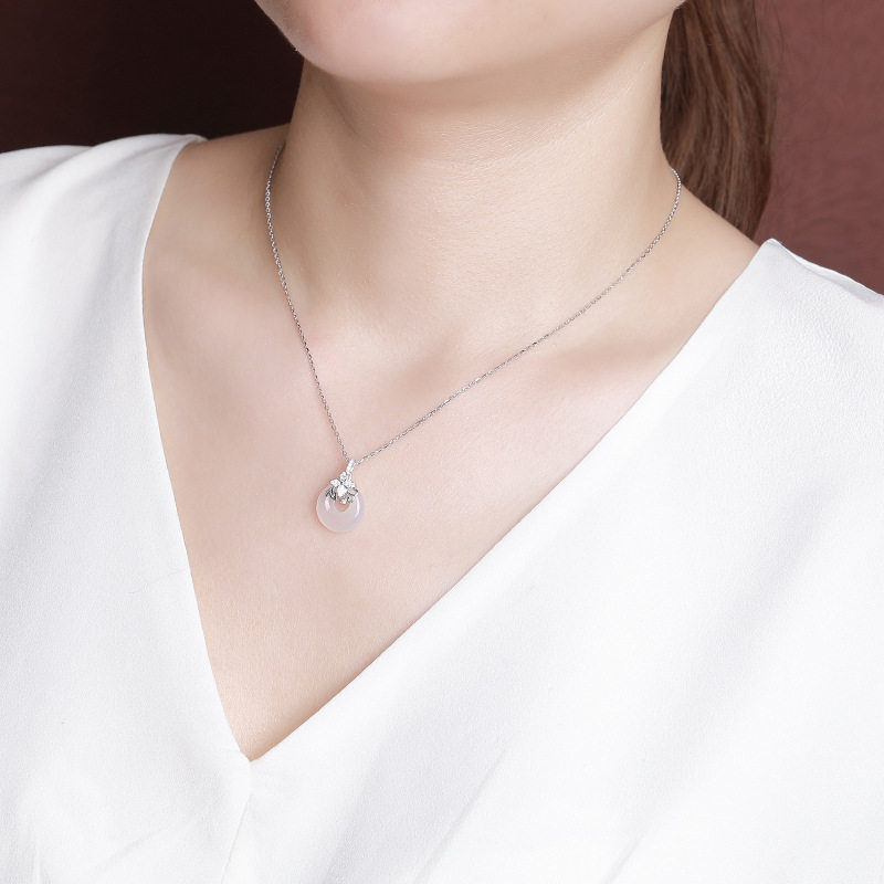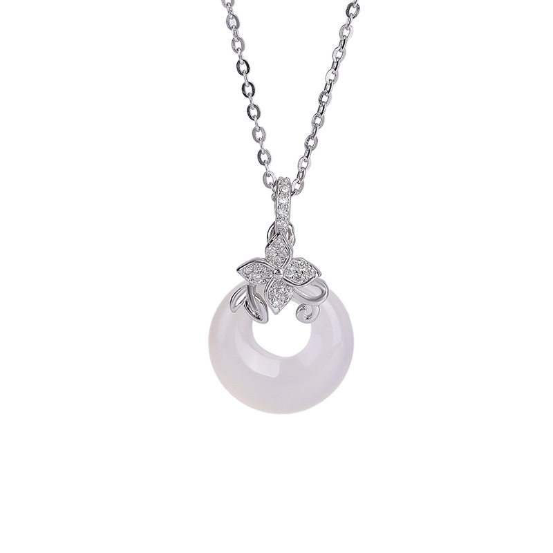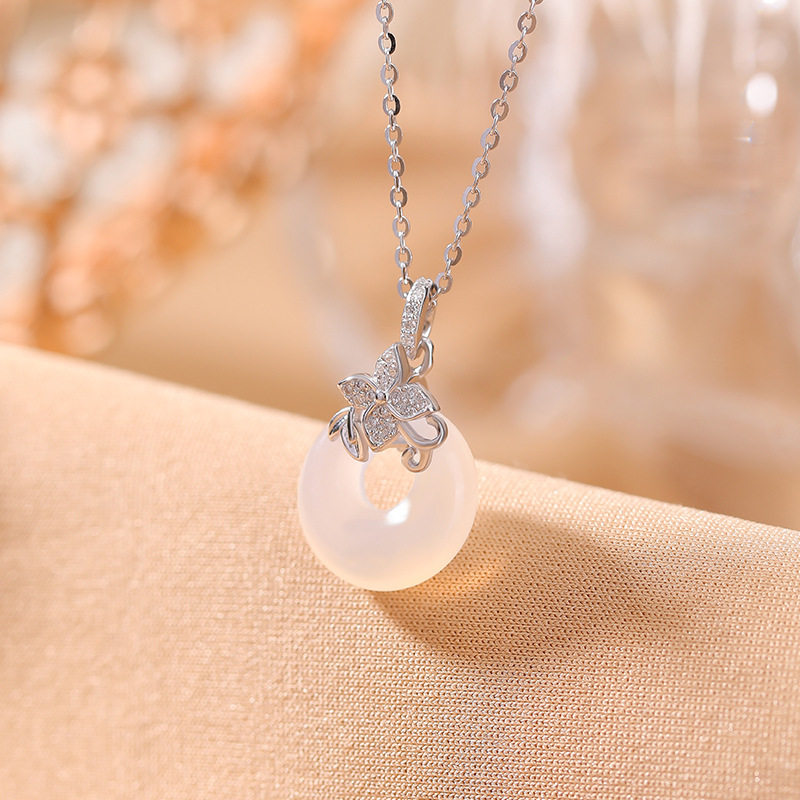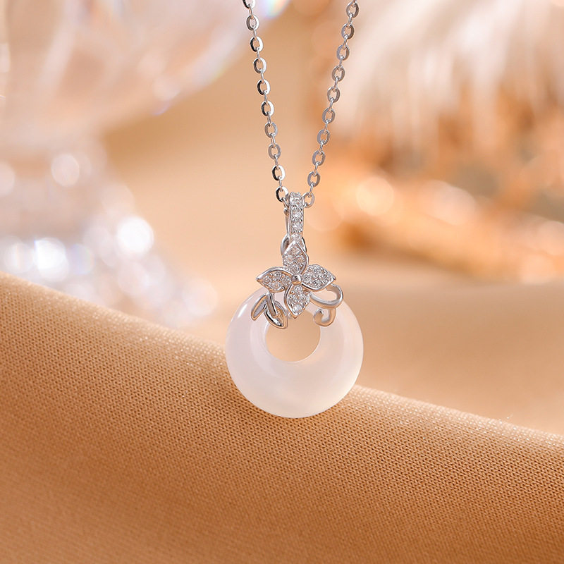 S925纯银白玉髓复古轻奢小众四叶草平安扣项链女时尚气质颈链百搭
