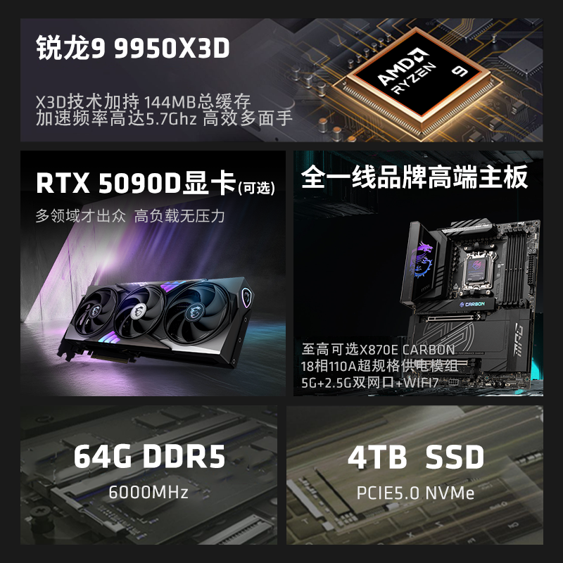 AMD锐龙9 9950X3D/RTX5090D/5080/5070Ti/组装电脑电竞打瓦三角洲游戏台式主机AI渲染生产力主机DIY组装机