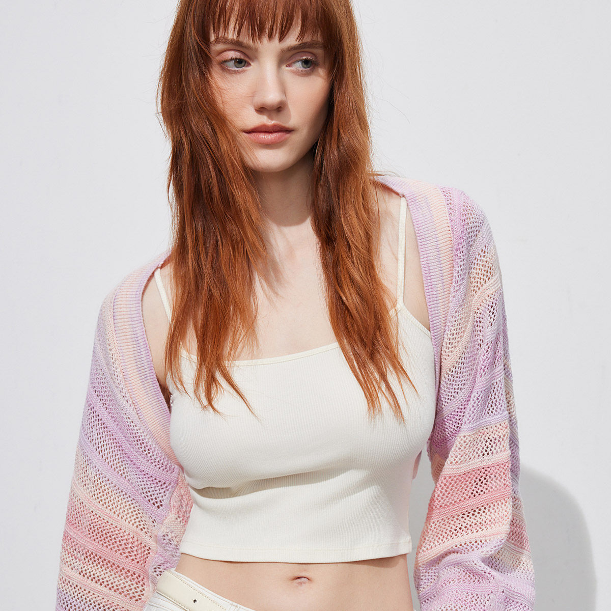 梦幻色镂空针织,罗纹拼接无扣门襟