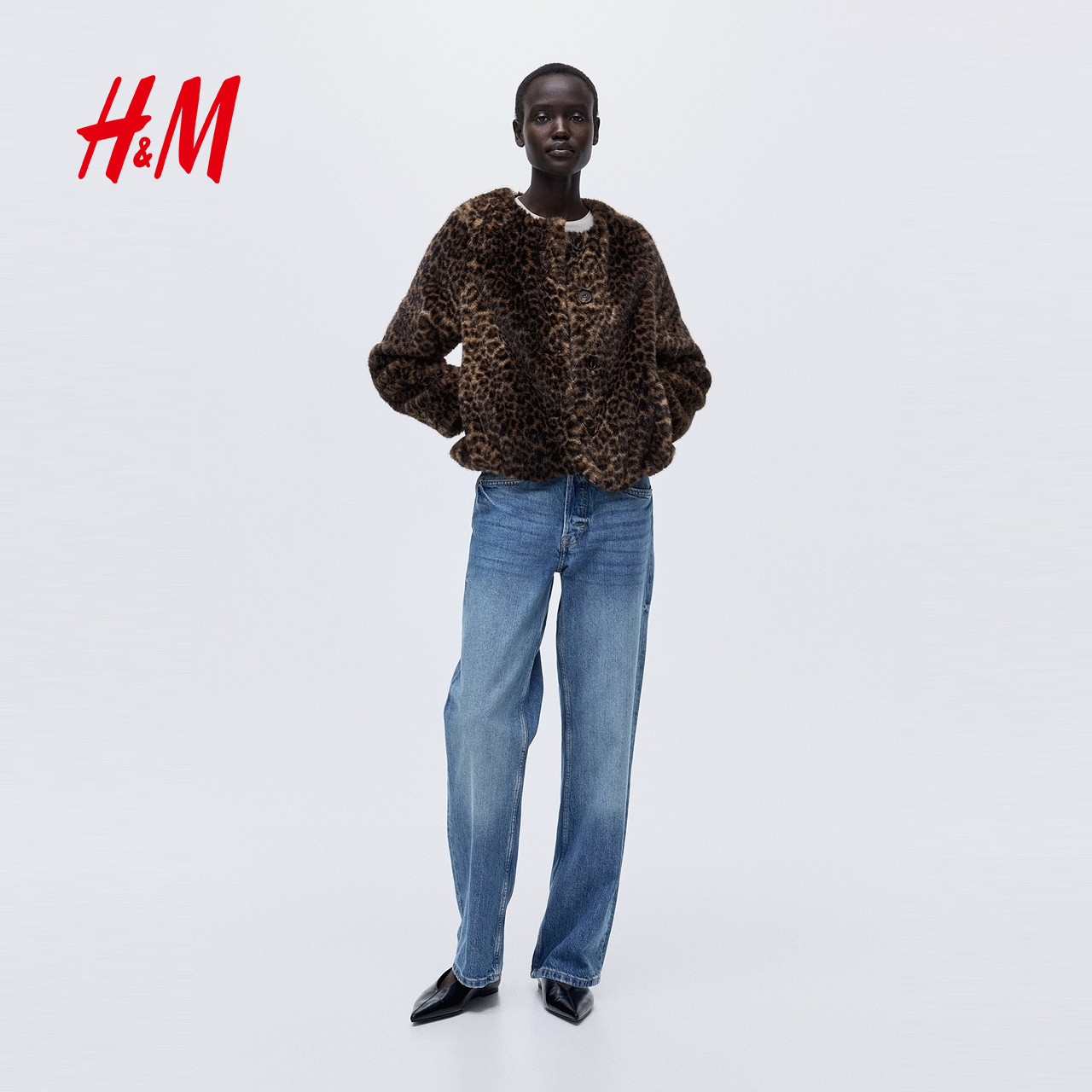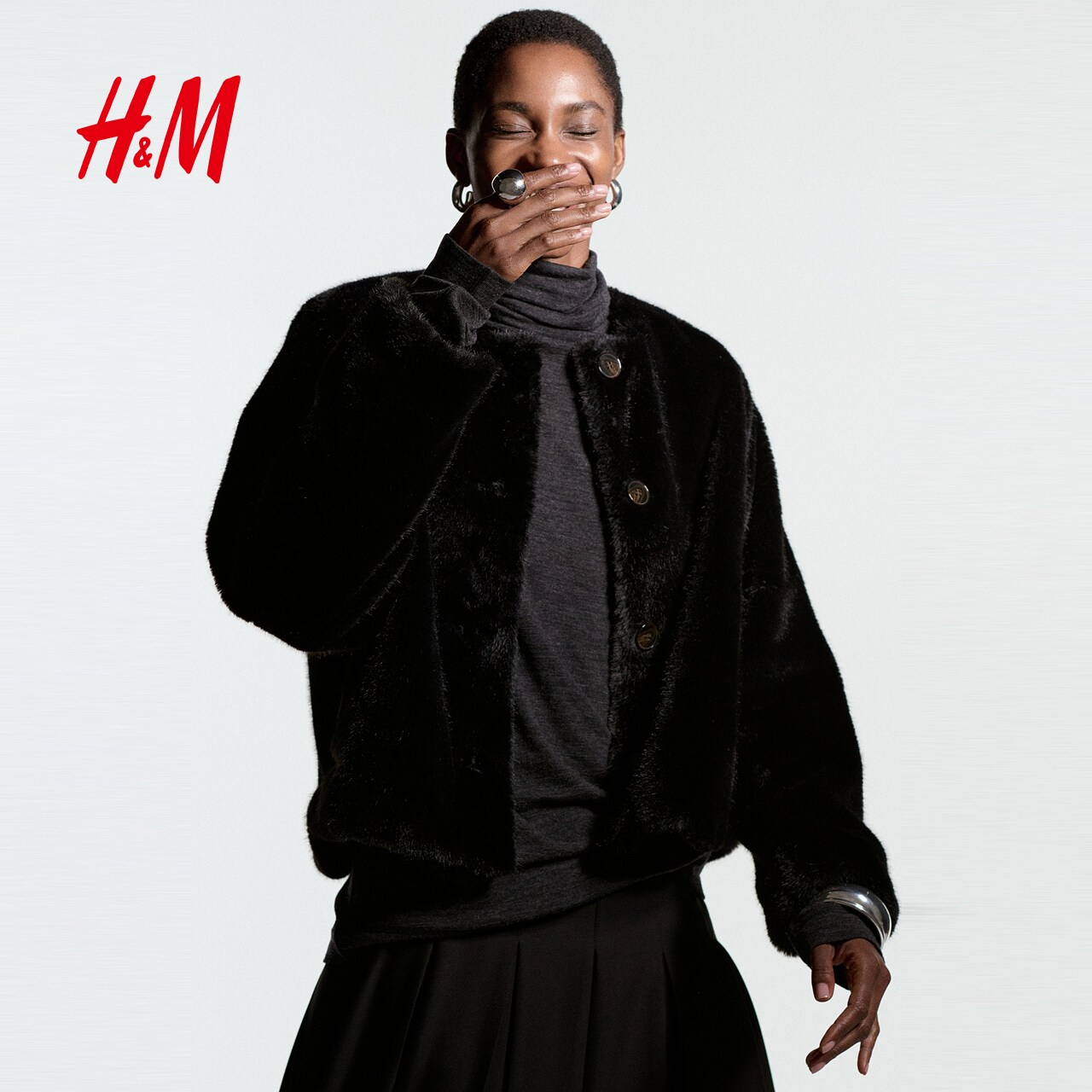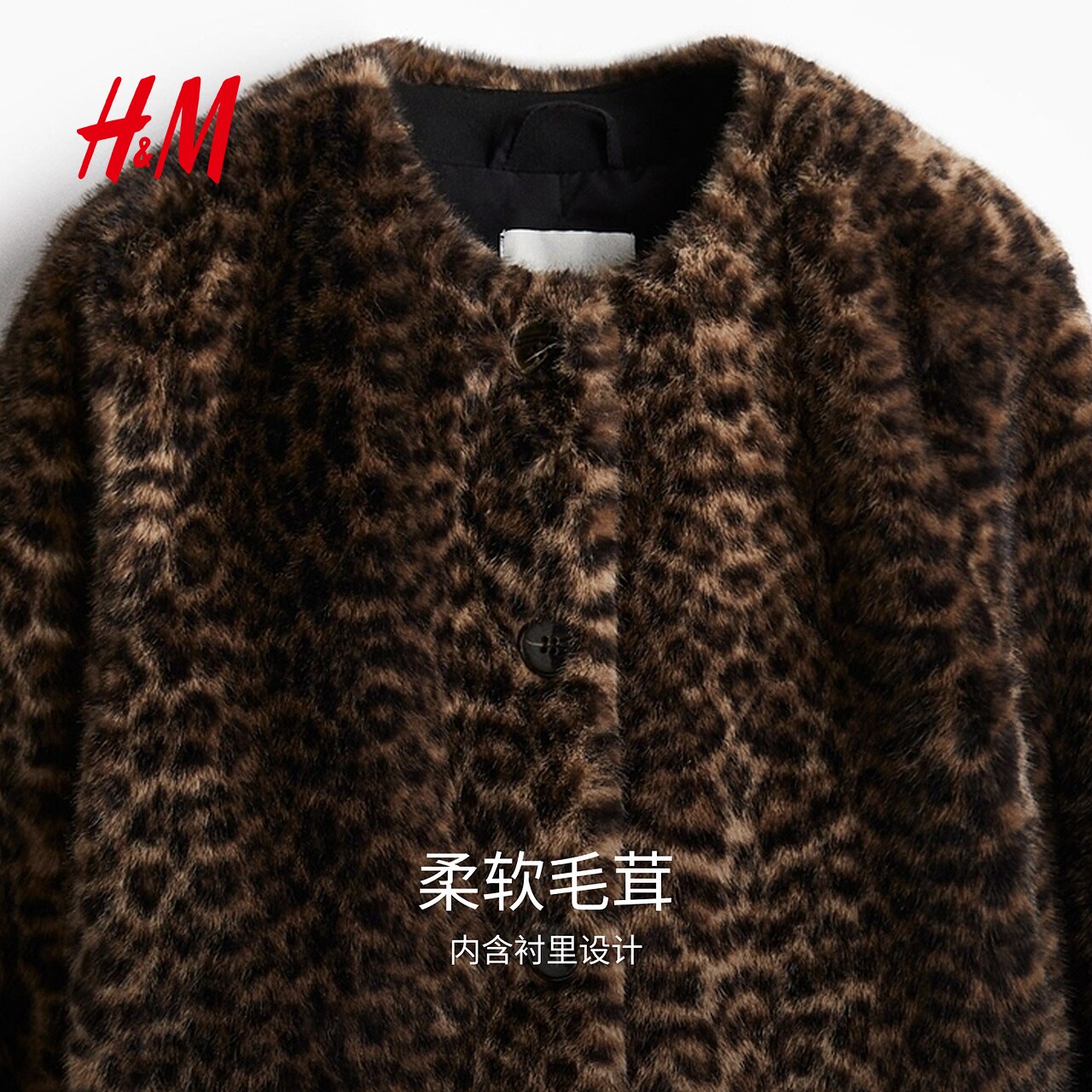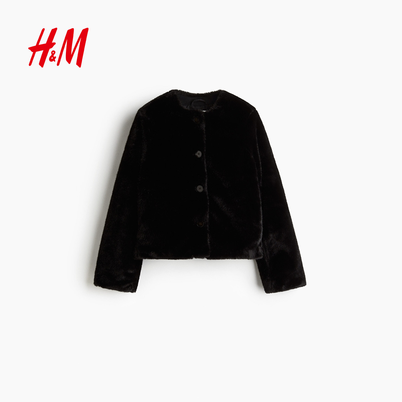 HM女装短外套2025年冬季新款圆领仿皮草毛绒保暖法式开衫1305848