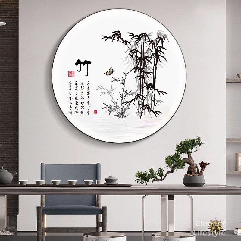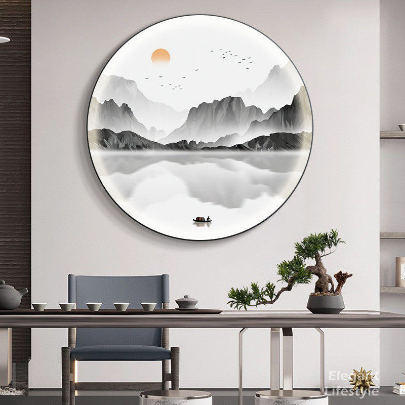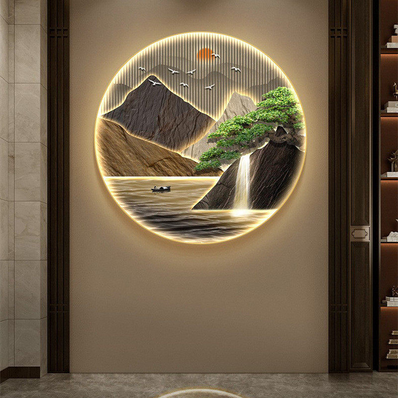 新中式装饰画led壁灯过道茶室圆形山水画客厅走廊画玄关创意挂画