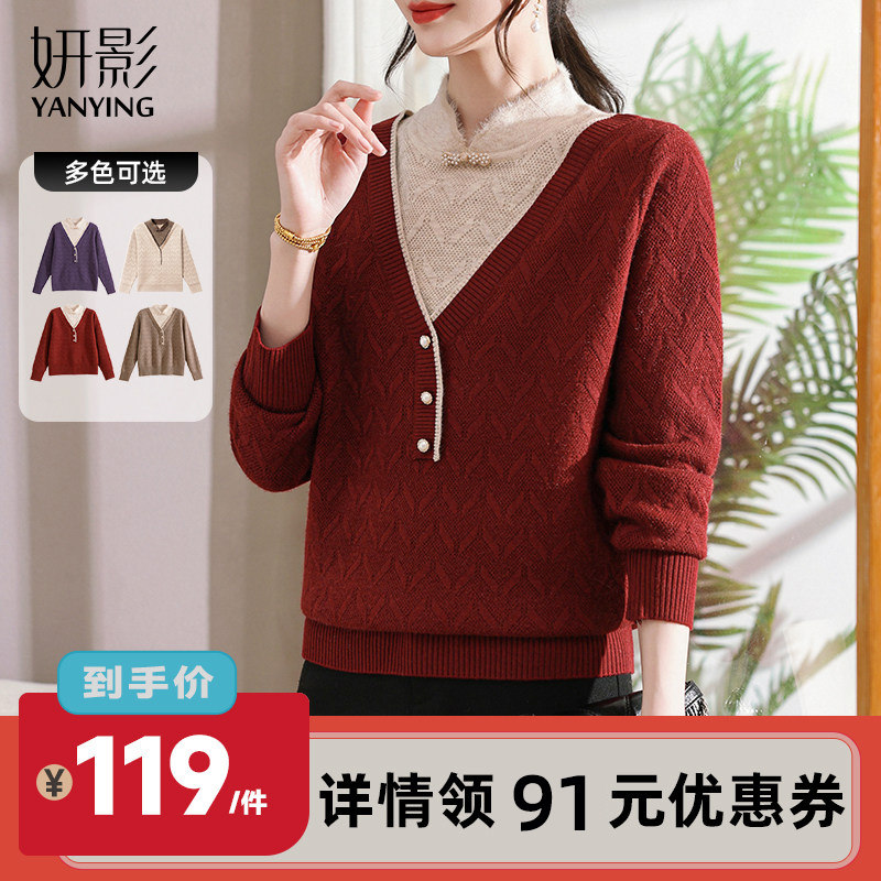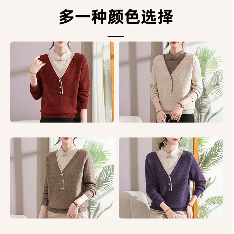 2025新款假两件针织衫中老年人女装加绒加厚毛衣妈妈冬装保暖内搭