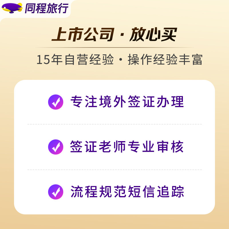 【品牌保障】同程旅行店铺,安心省心 【放心优选】多种套餐选择,方便办理 【优质服务】专业团队办签,高出签率 【流程透明】进度实时更新,办理无忧