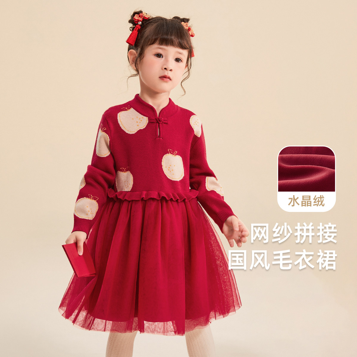 NORNOR陈大猪女童红色毛衣裙25冬款保暖好看新中式儿童年装连衣裙